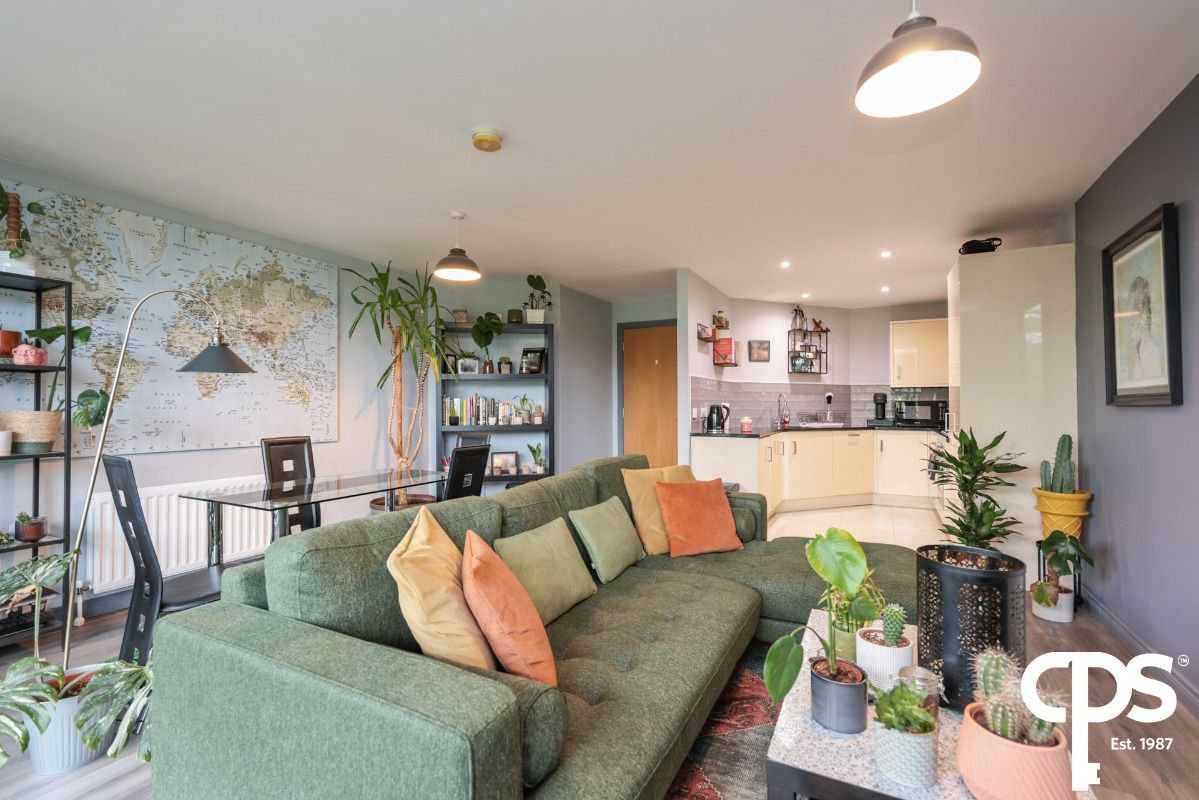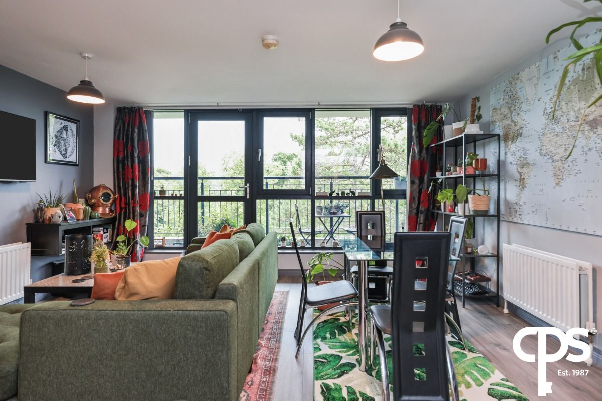 This open-plan space features a modern fitted kitchen with a range of high and low units, integrated appliances, tiled flooring, and tiled splashback. The adjoining living area is bright and spacious, enhanced by floor-to-ceiling windows and a patio door opening onto the private balcony. Finished with laminate wood flooring and tasteful décor.