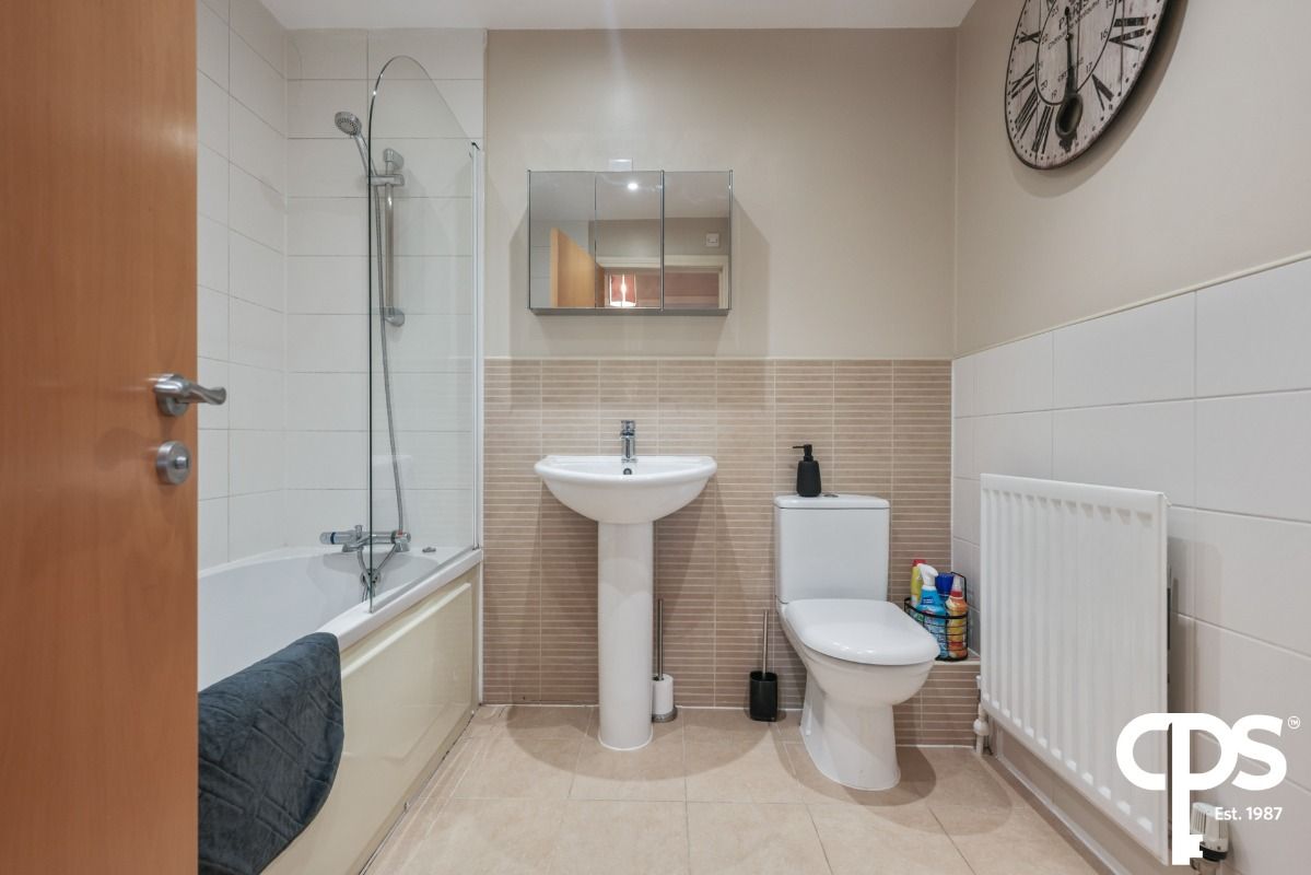 Contemporary main bathroom with a modern white three-piece suite including a shower over the bath, sink, and WC. Finished with tiled flooring and tiled wall surround.