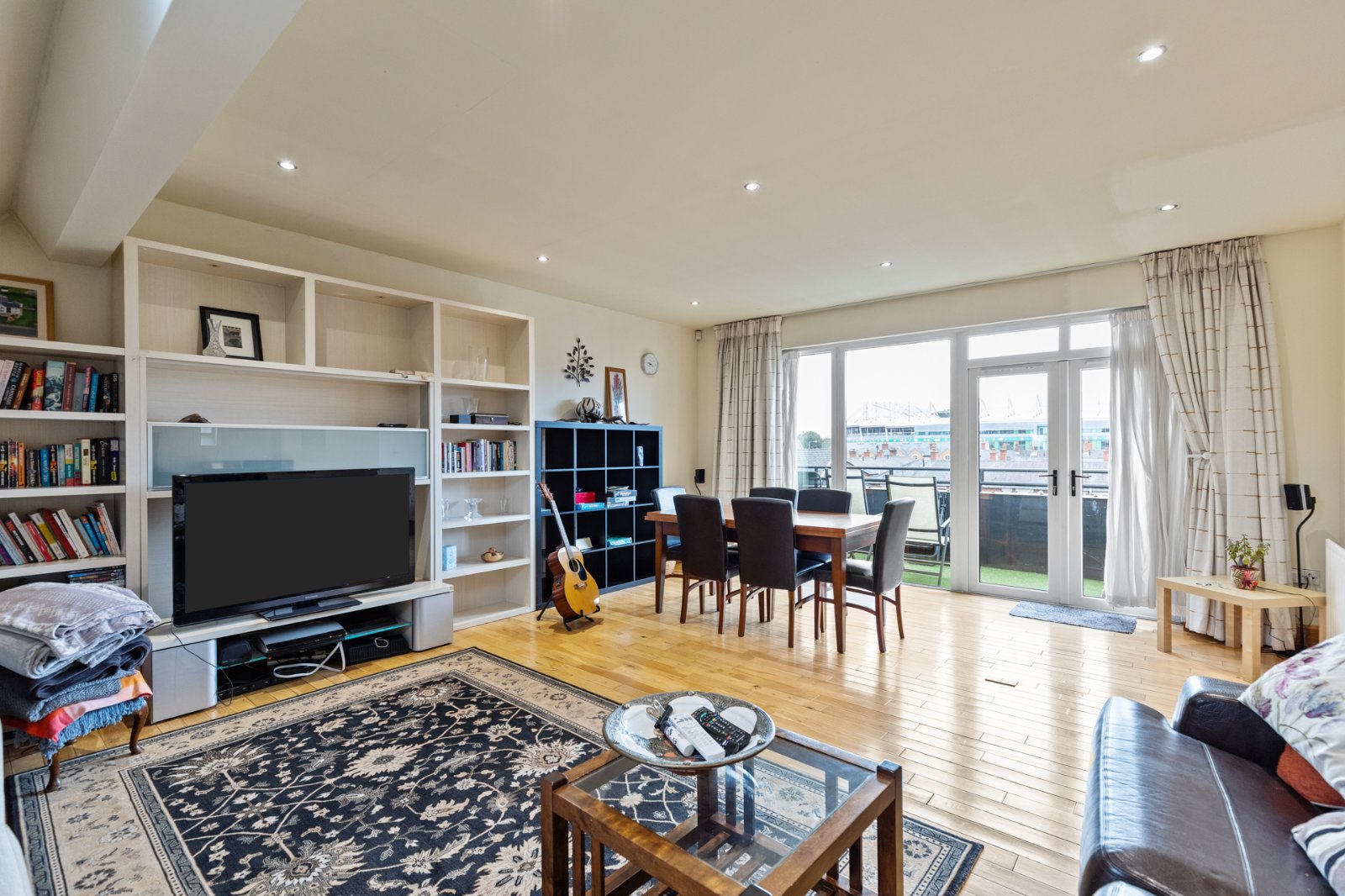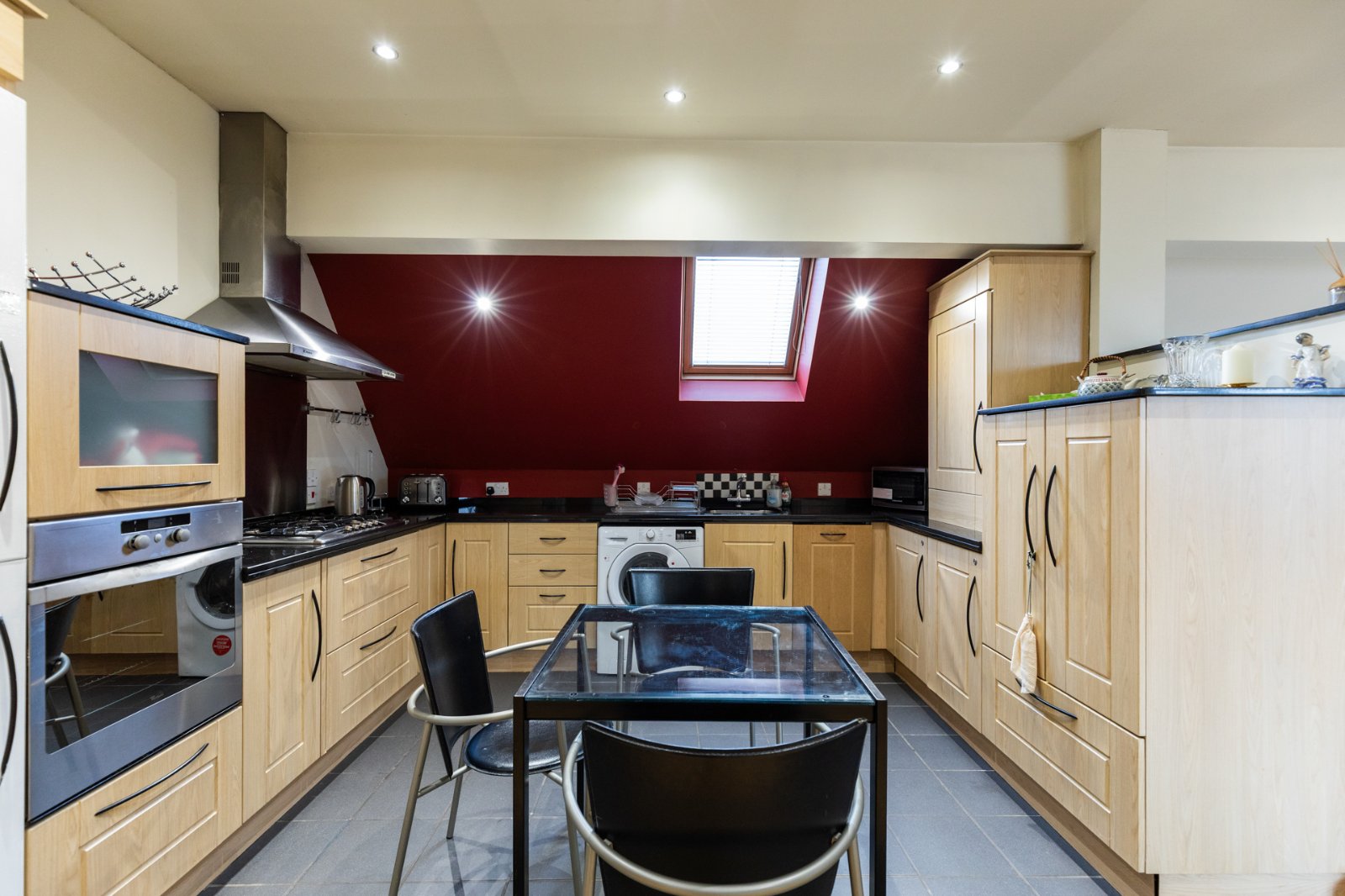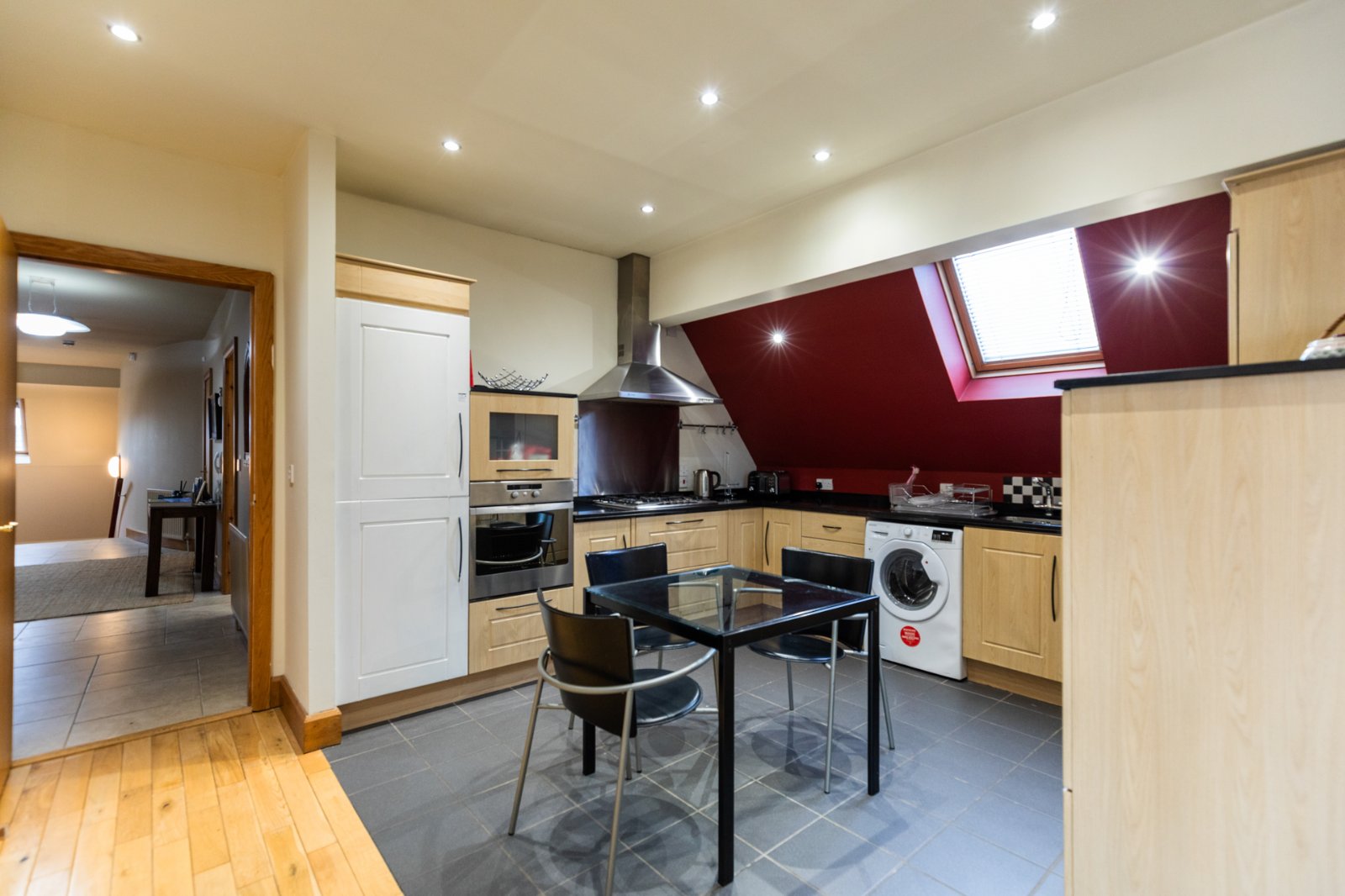 Kitchen with range of units and integrated appliances. Living/Dining with balcony access