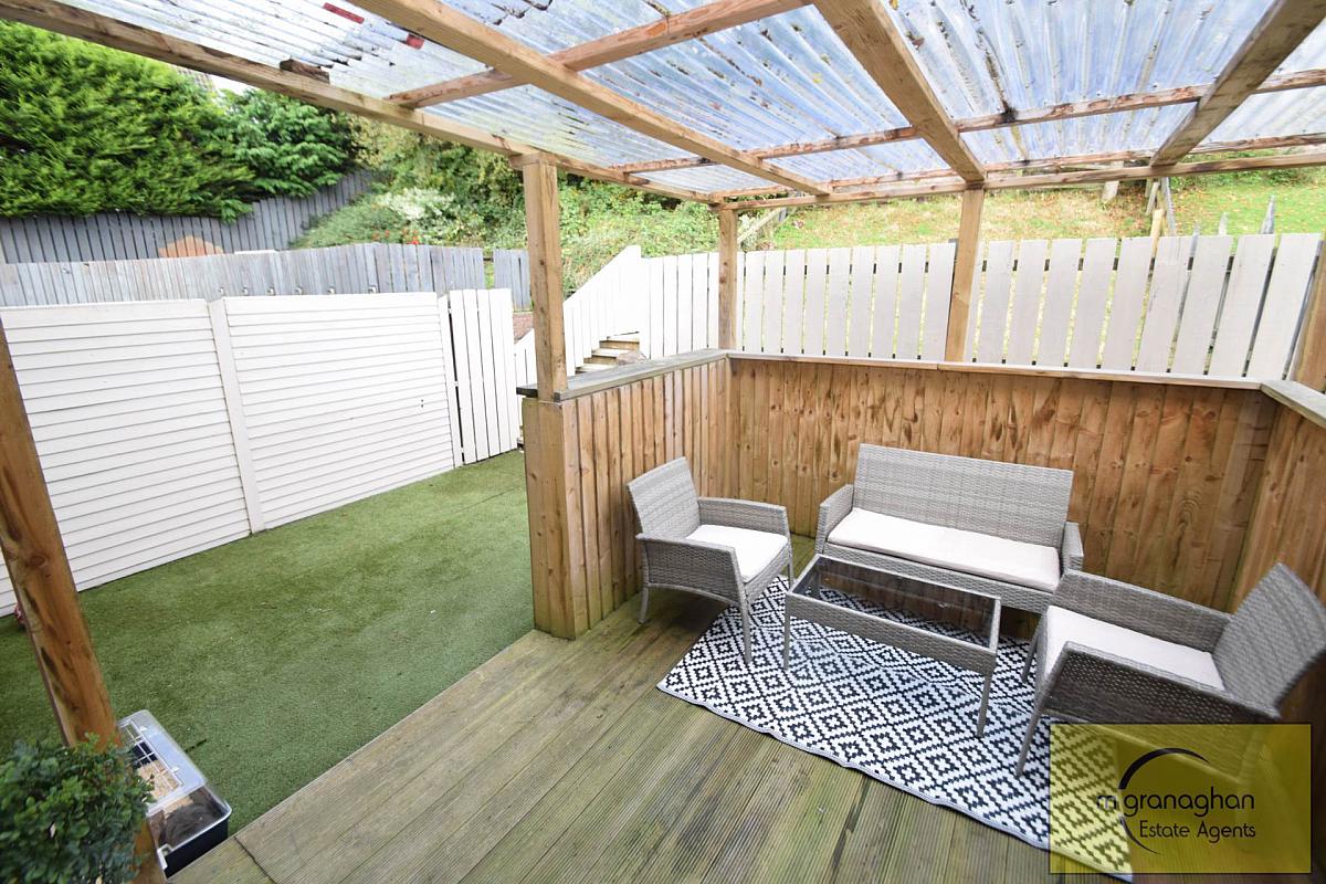 Two tier rear with patio area offering a bespoke pergola with poly carbonate roofing and elevated gardens in lawn