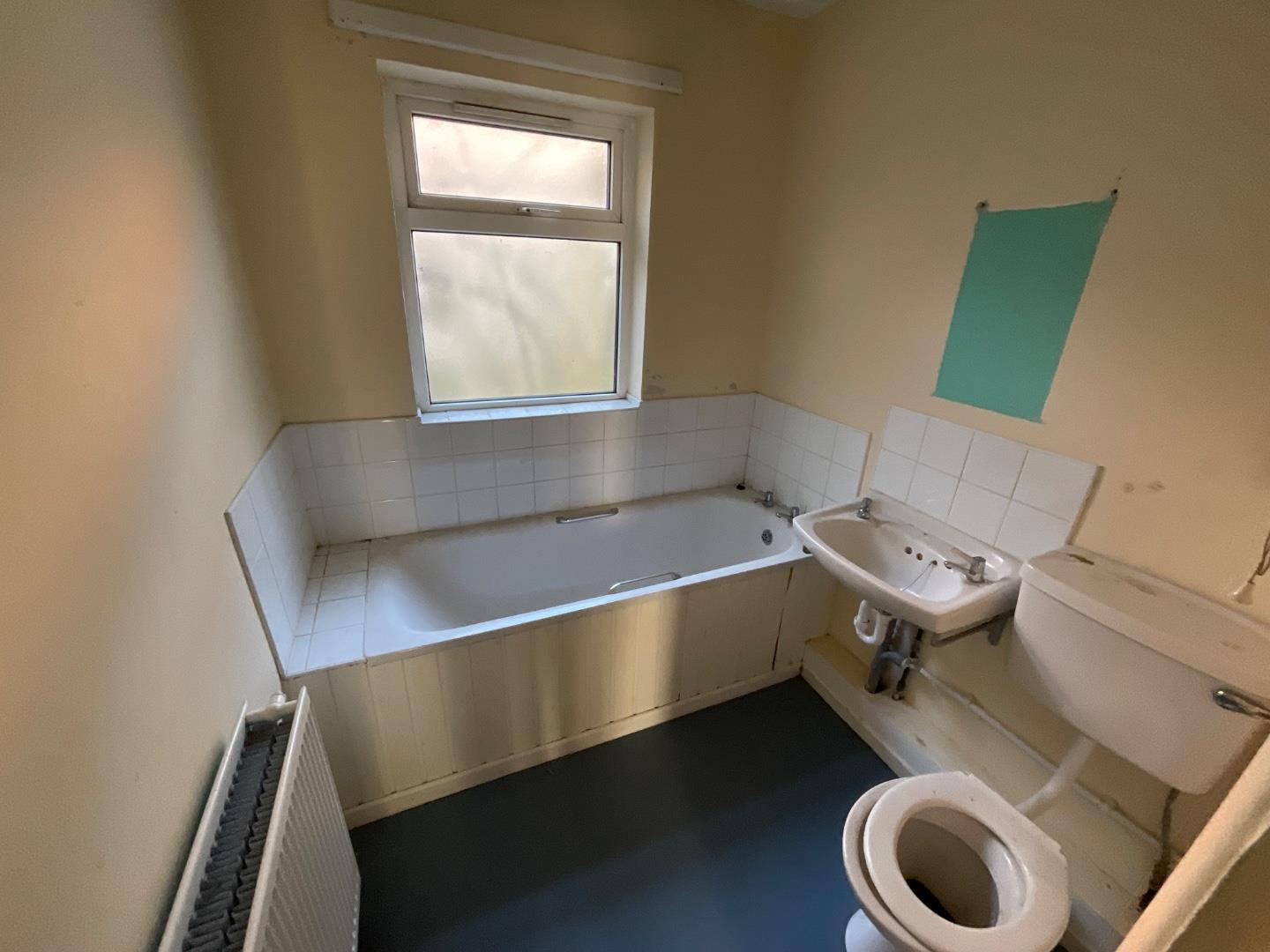 Downstairs Bathroom Classic white bathroom suite including low flush WC, wall mounted wash hand basin and panelled bath, enclosed storage cupboard, double panelled radiator