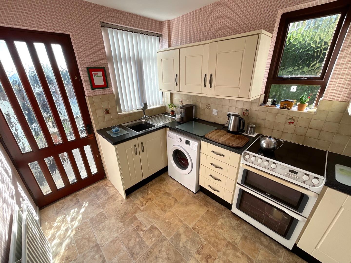 Kitchen 11'0" X 7'7" (3.36m X 2.33m) Modern fitted kitchen with both high and low level units, tiled splash backs and contrasting worktops, stainless steel sink and drainer with mixer tap, cooker space, fridge freezer space, plumbed for a washing machine, vinyl flooring, double panelled radiator, access to rear garden