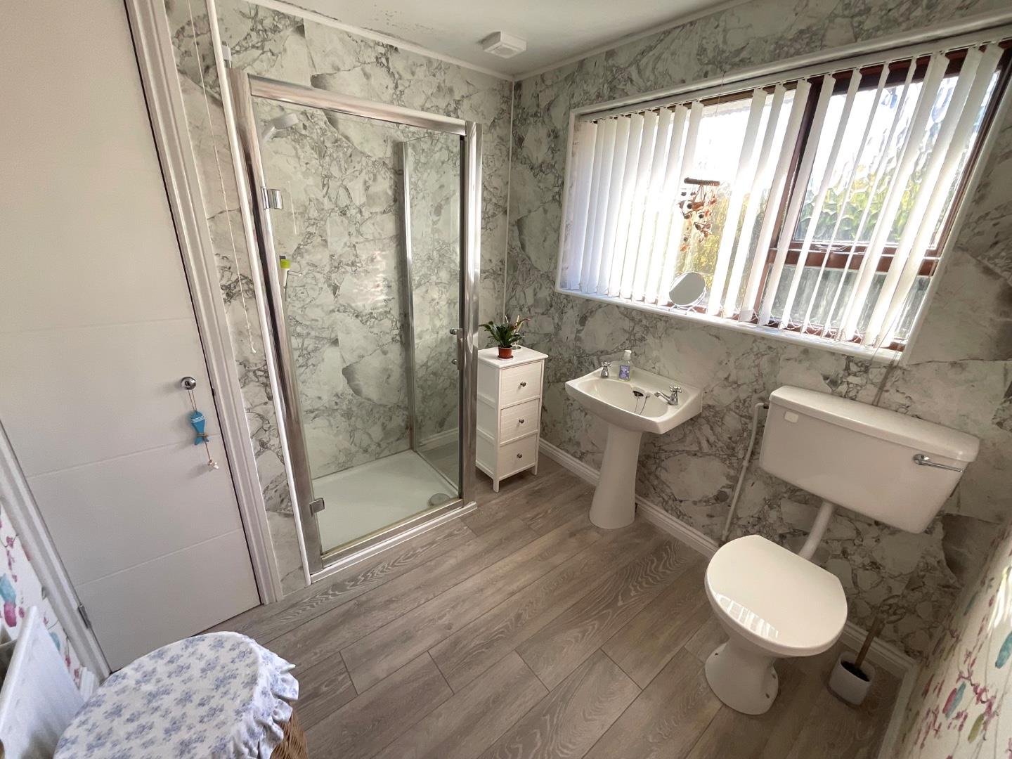 Bathroom Classic white bathroom suite including low flush WC, pedestal wash hand basin and free standing electric shower, enclosed hot press with additional storage, wood laminate flooring, double panelled radiator