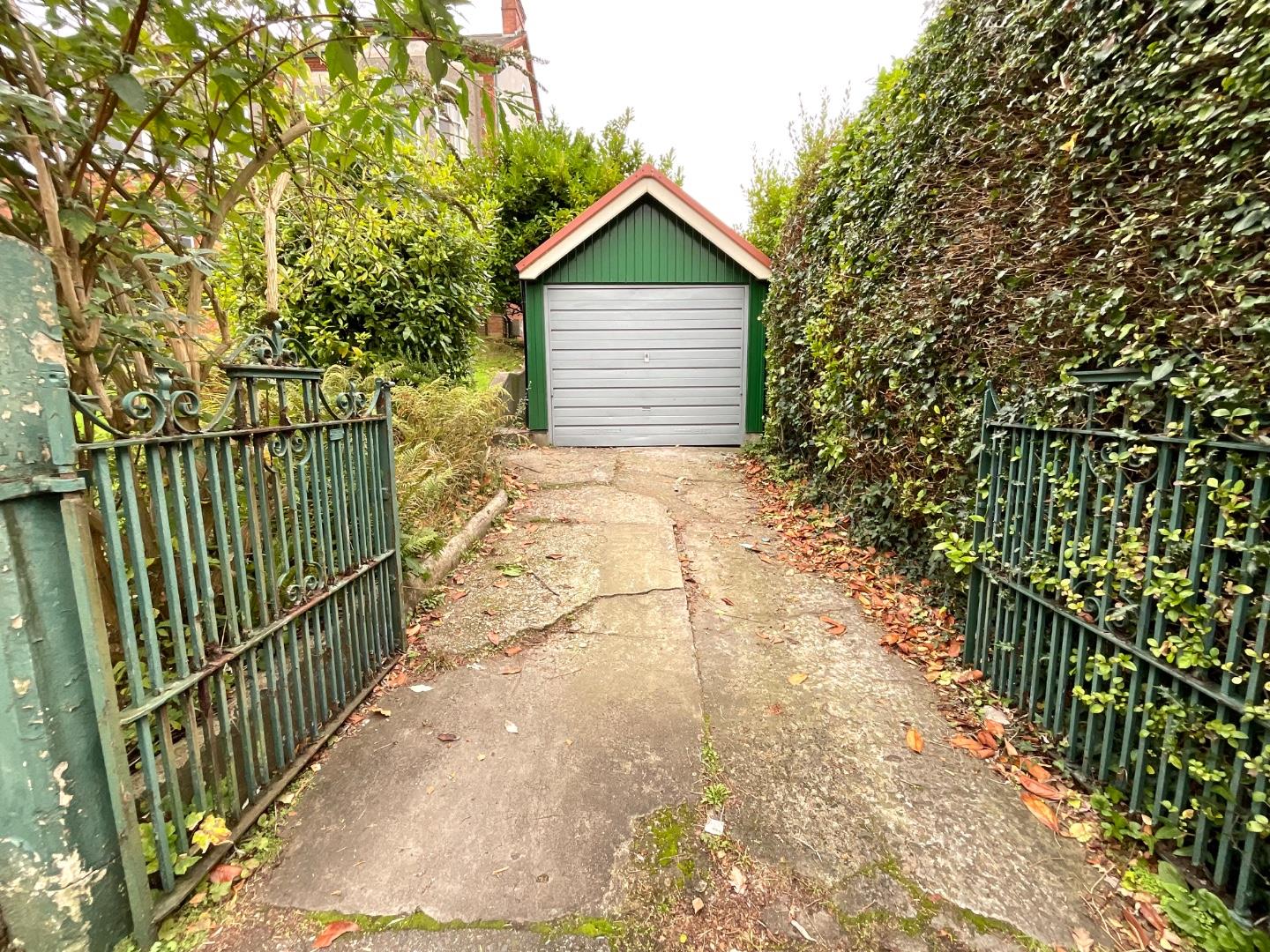 Metal privacy fencing and entrance gate, paved driveway, detached garage with up and over door, mature gardens laid out in lawn with various shrubs and trees, winding steps leading to front door, lean to patio to side, storage shed with plumbed WC