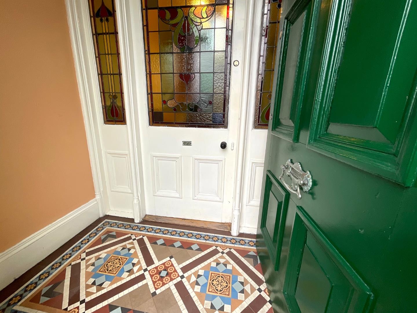 Hardwood front door, stunning mosaic tiling, wooden internal door with stained glass insets leading to: