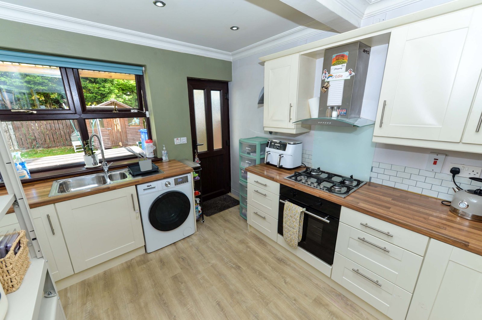 One and 1/2 bowl sink unit with pull out spray mixer tap. Excellent range of high and low level units with stainless steel door furniture and wood effect work surfaces. Integrated four ring gas hob and built in oven with chimney extractor hood. Plumbed for washing machine. Space for fridge / freezer. Partly tiled walls. Recessed spotlighting. Under stairs storage. uPVC door to enclosed rear garden.