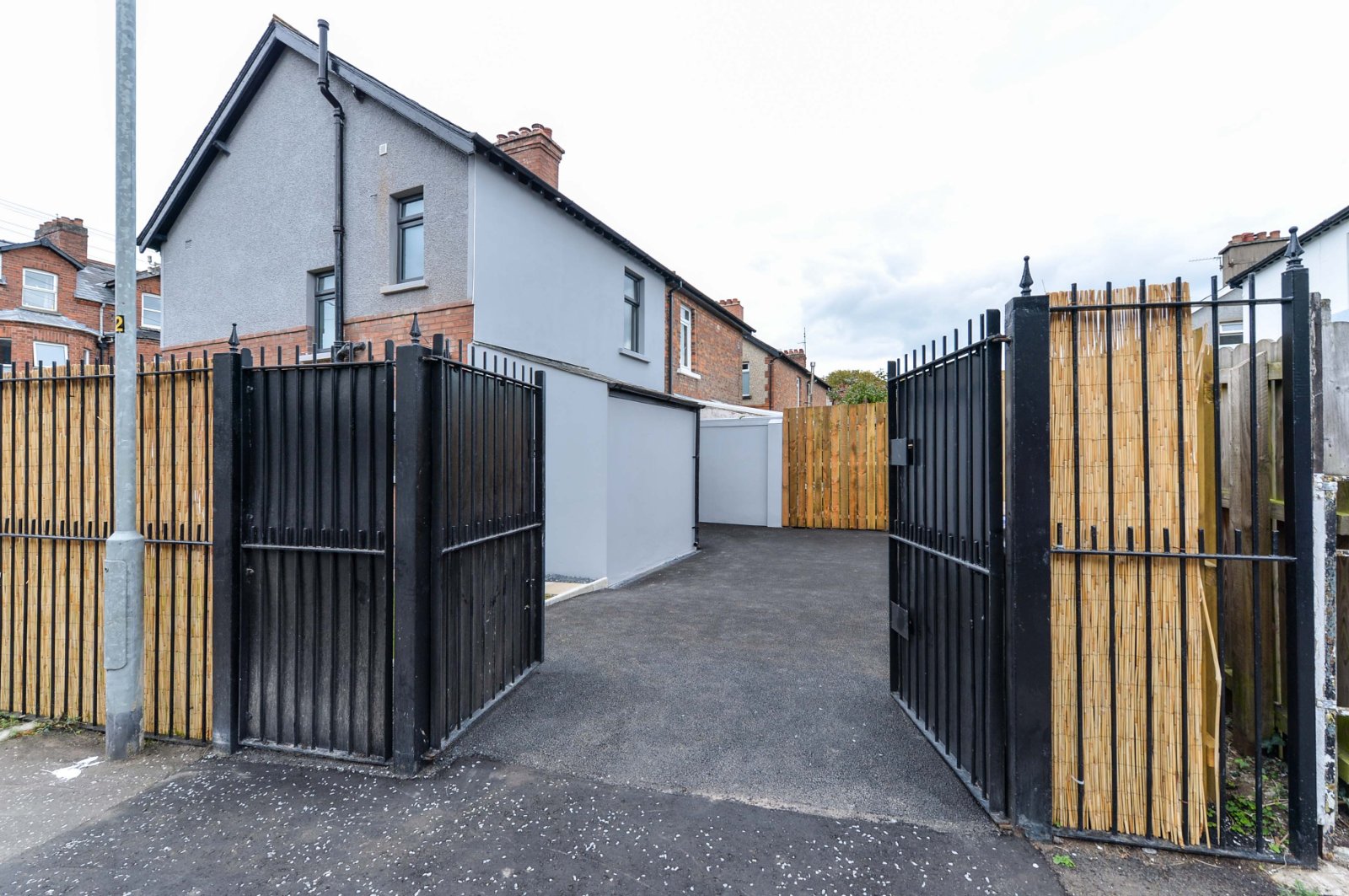 Outside Tarmac driveway to off street car parking, side access via double entrances gates.