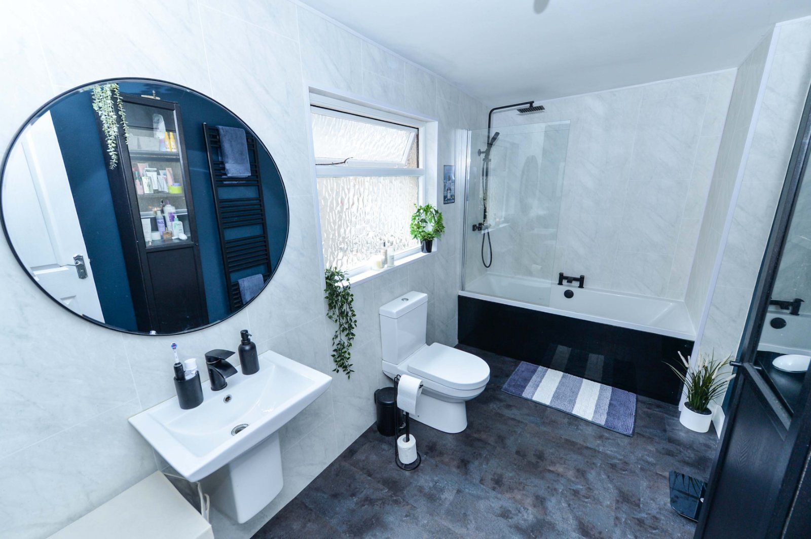 Comprising panelled bath with dual mixer tap. Thermostatically controlled shower unit with overhead drencher. Semi pedestal wash hand basin with dual mixer tap. Dual flush w/c. Heated towel rail. Part PVC panelled walls.