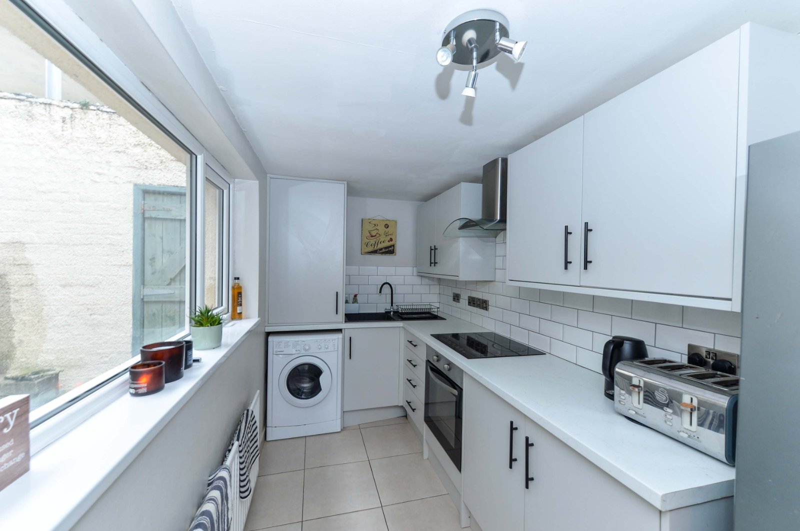 One bowl sink unit with dual mixer tap. Excellent range of high and low level units with formica work surfaces. Integrated four ring electric hob and built in oven with chimney extractor hood. Space for fridge / freezer. Plumbed for washing machine. Built in storage with Worchester gas fired boiler. Partly tiled walls. Ceramic tiled flooring. Under stairs storage. uPVC door to enclosed rear yard.