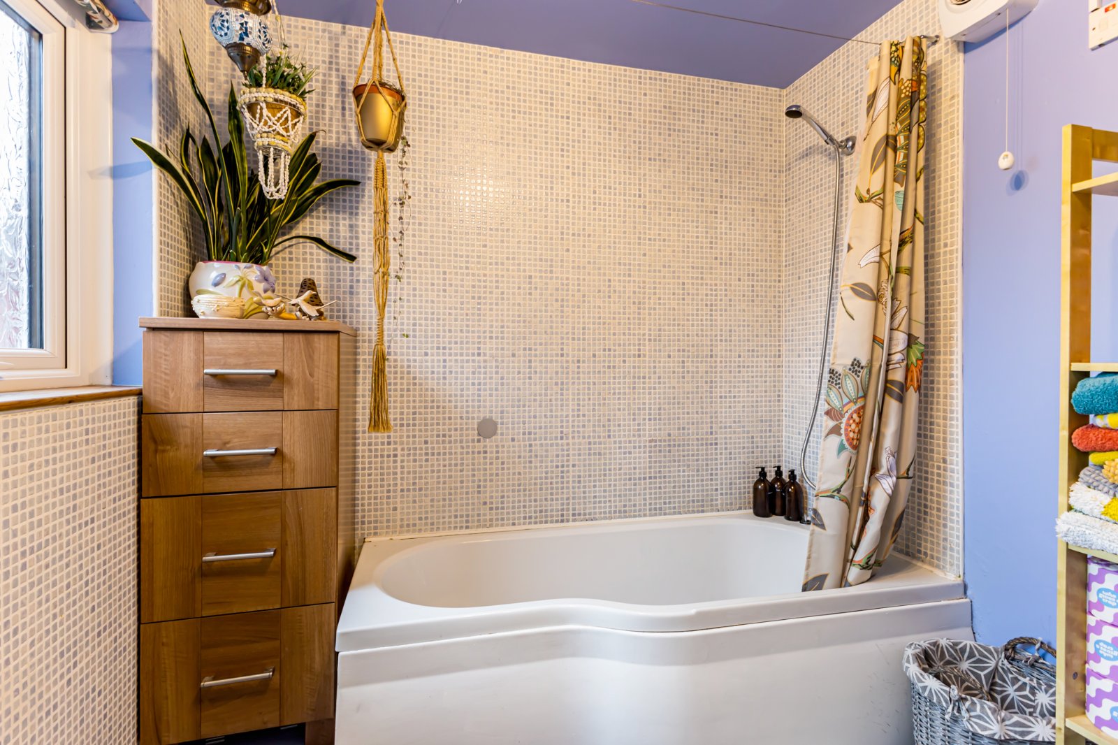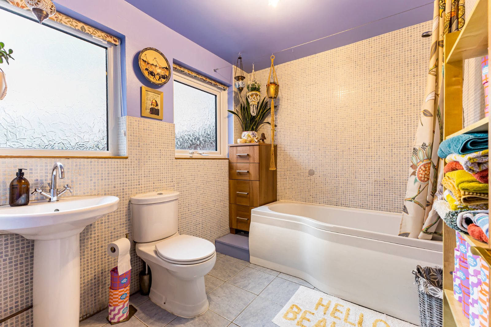 A very generously sized bathroom with three piece suite to include a low flush wc, wash hand basin with mixer tap, and bath, with an overhead shower unit. The bathroom has a tiled floor and partially tiled walls.