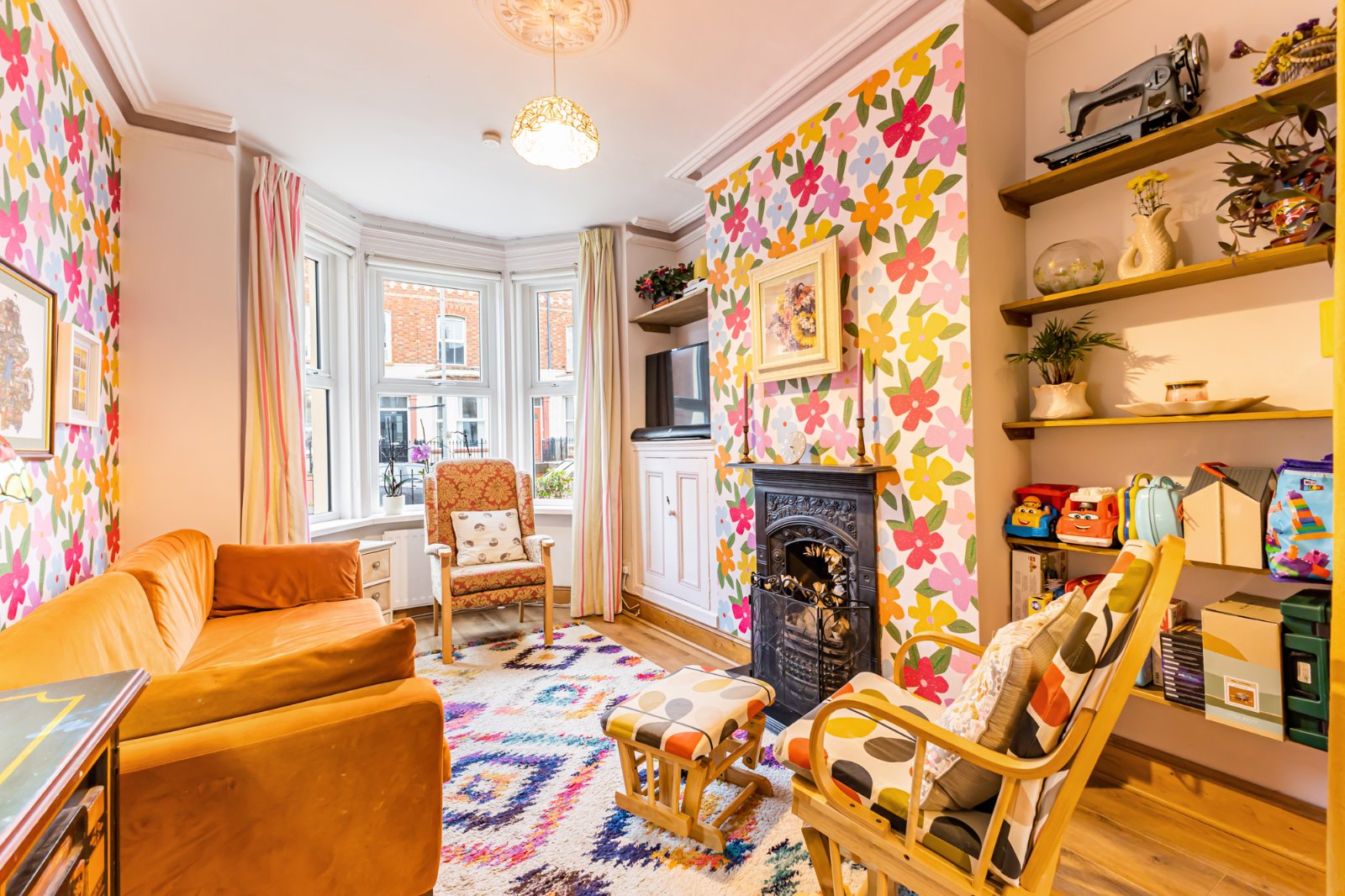 A bright and spacious living room with bay window, laminate flooring and original ceiling & rose cornicing.
