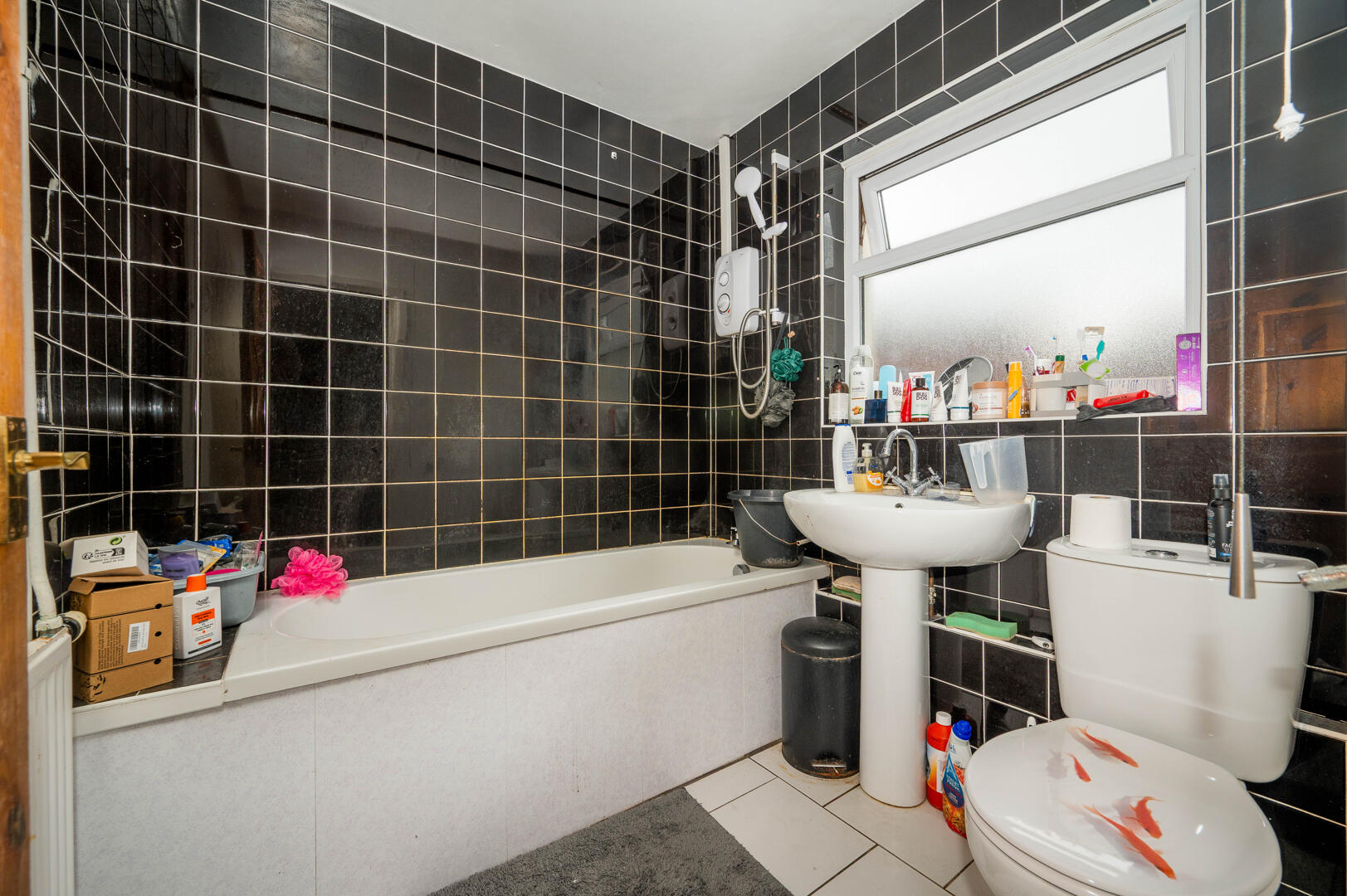 Family Bathroom: White suite comprising low flush WC with push button, pedestal wash hand basin and chrome mixer taps, panelled bath with electric shower and telephone hand unit, fully tiled walls, tiled floor, frosted glass window.