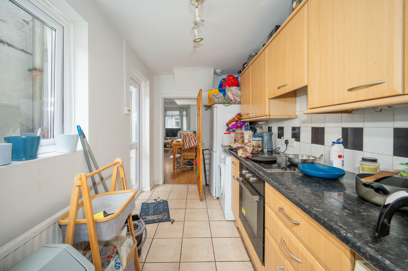 Kitchen: 14'3" X 6'4" (4.34m X 1.93m) With excellent range of high- and low-level units, stainless steel fittings, laminate worktop, stainless steel sink and chrome mixer tap, built-in low-level oven, four ring electric hob, extractor hood above, plumbed for washing machine, plumbed for dishwasher, space for fridge freezer, ceramic tiled floor, outlook to rear, uPVC double glazed access door to rear yard.