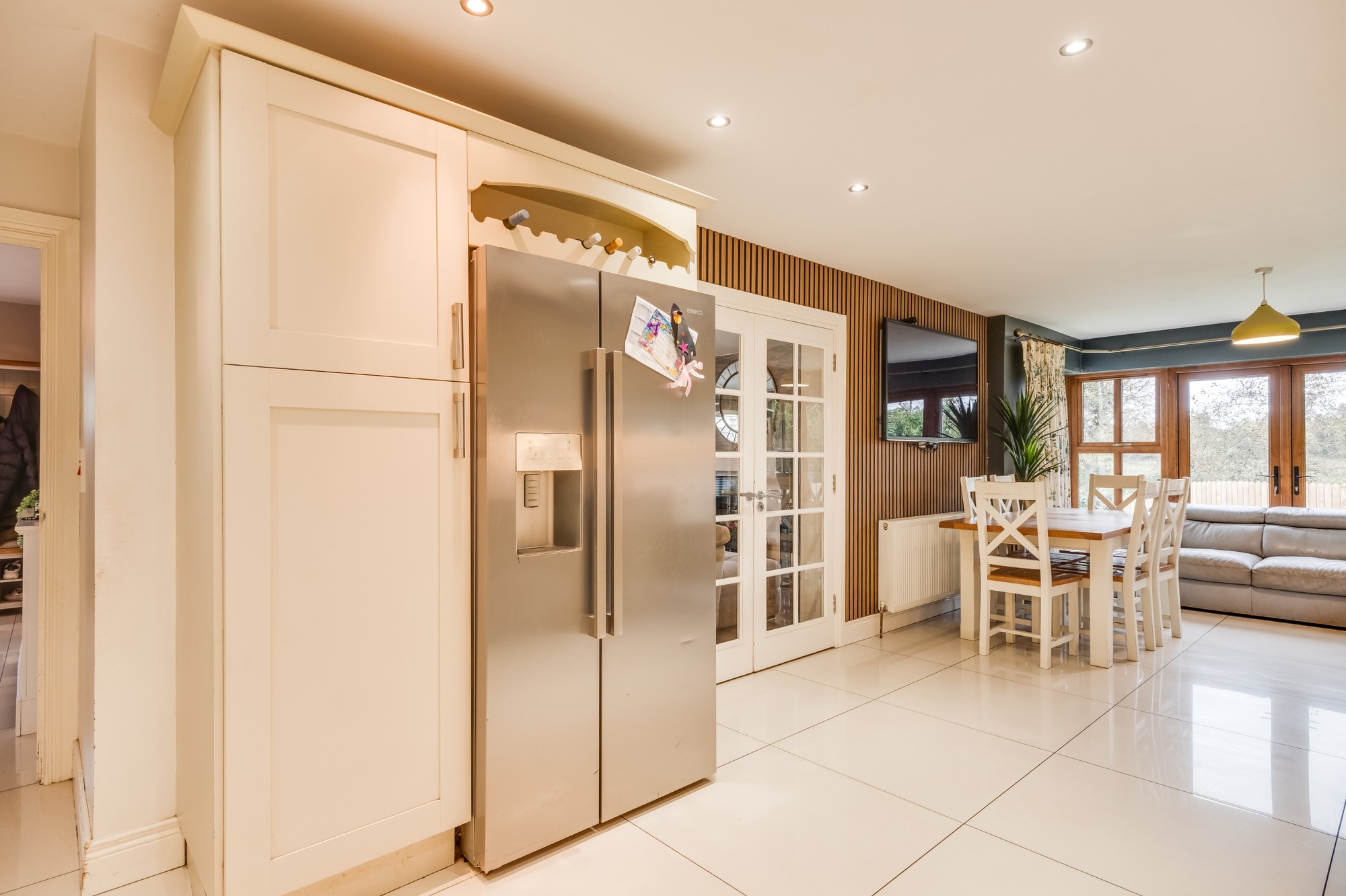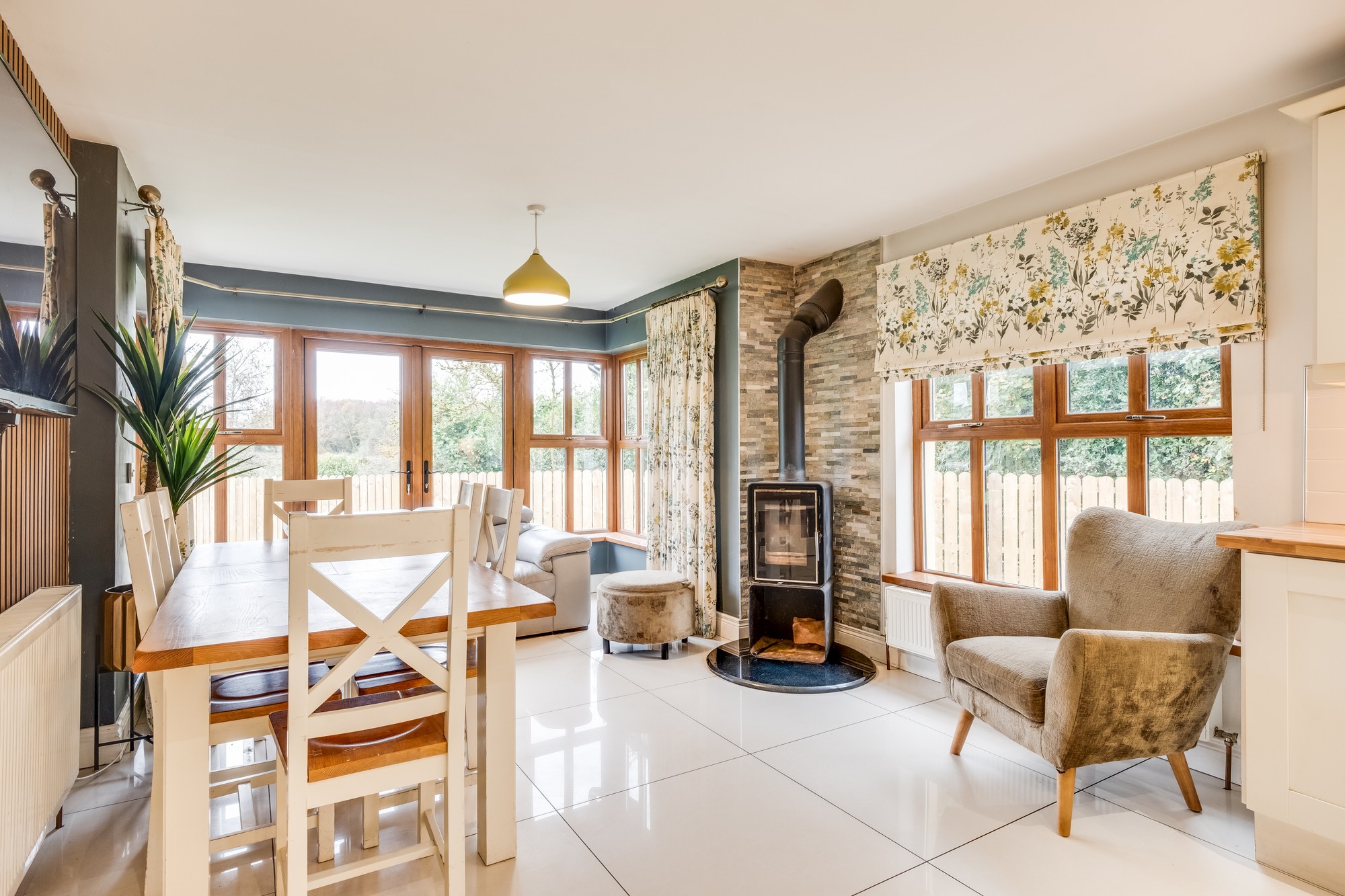 Fitted kitchen with a range of high Room, Dining Area & low level units, integrated electric hob electric oven & grill, hob, dishwasher, plumed for American fridge freezer, s.s.sink unit, s.s.extractor fan hood, tiled floor & splash back, wine rack, multi fuel stove, stonework feature wall, panelled feature wall, double patio doors to garden and patio area, tiled floor & splash back, recessed lighting.