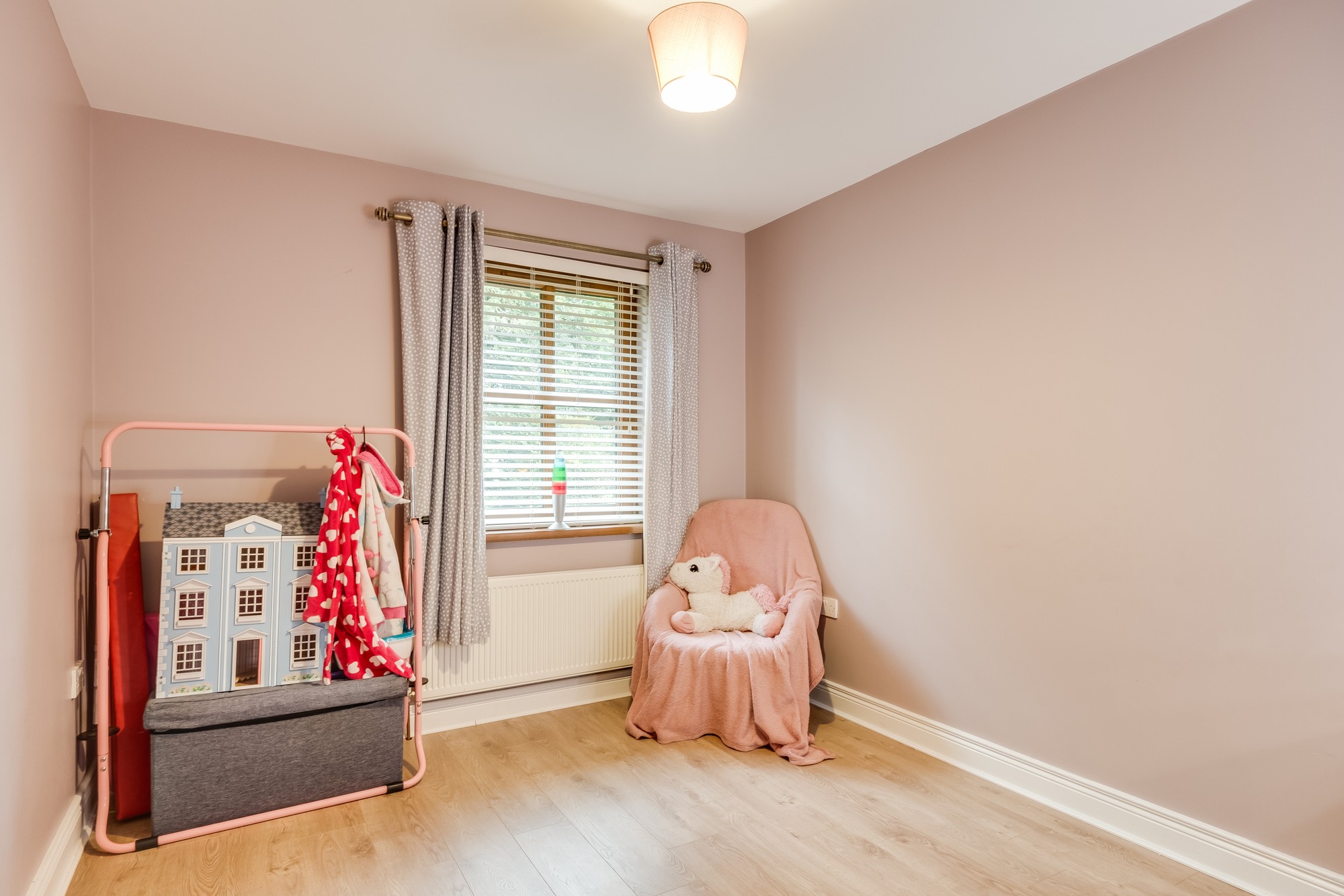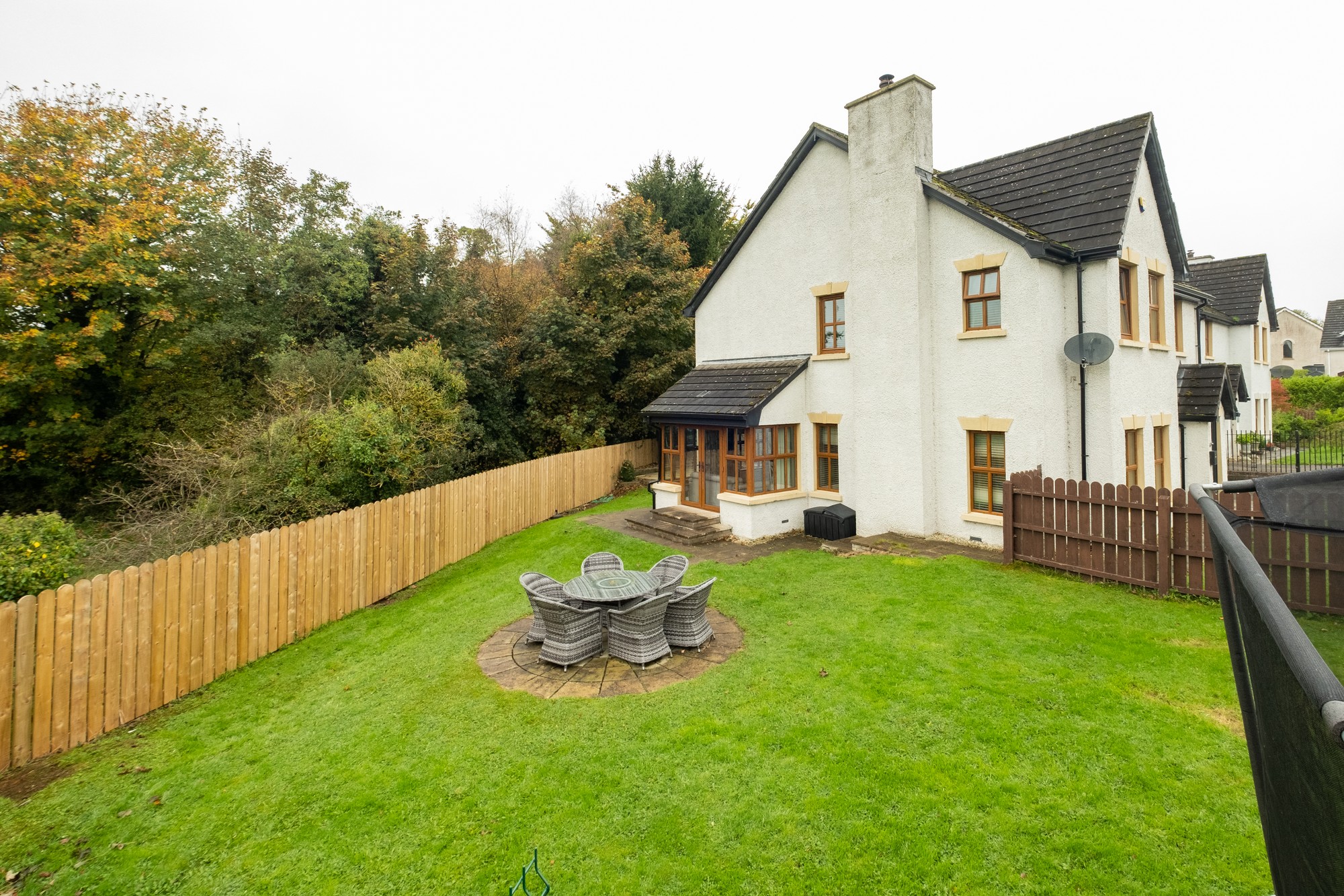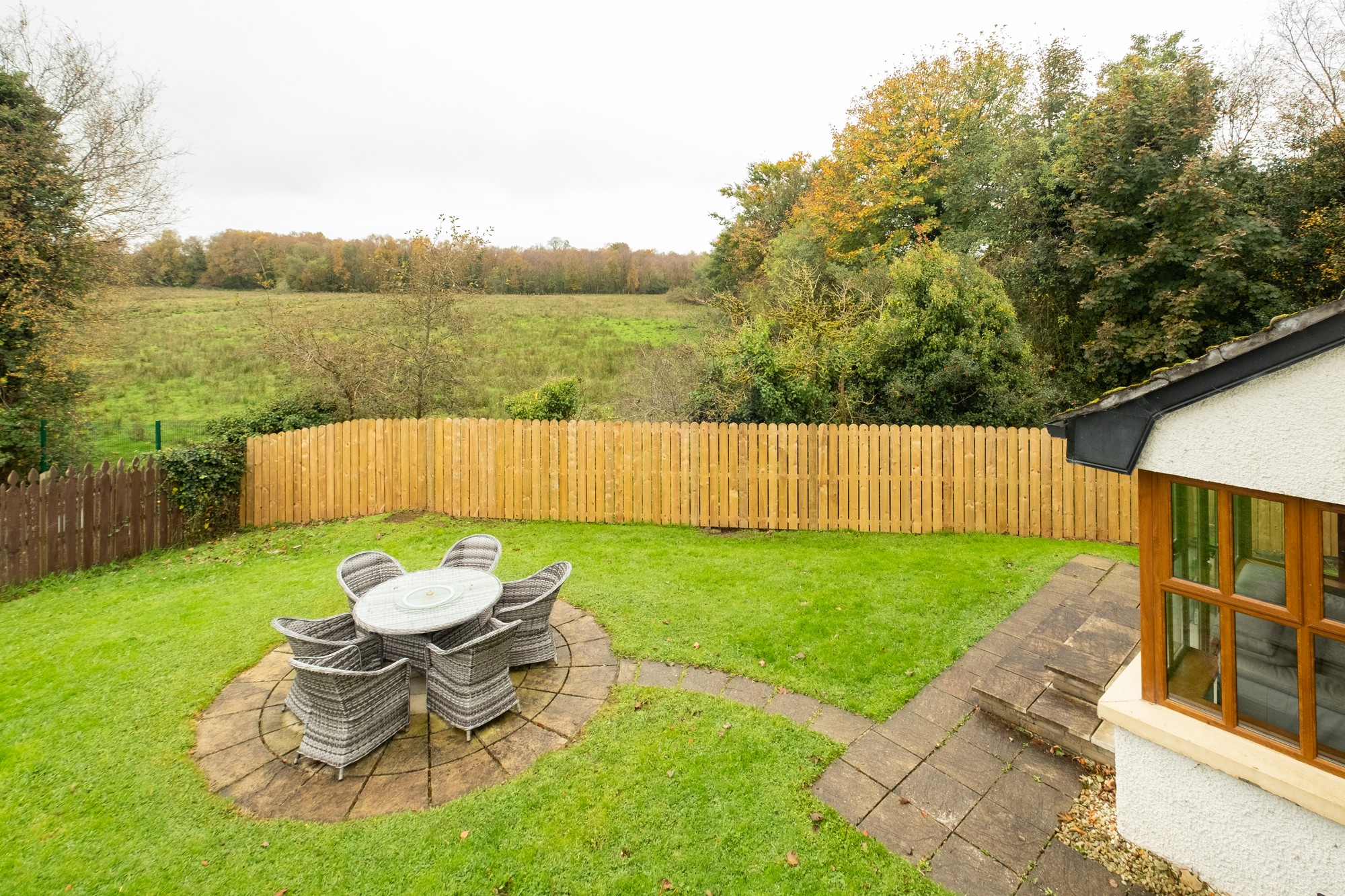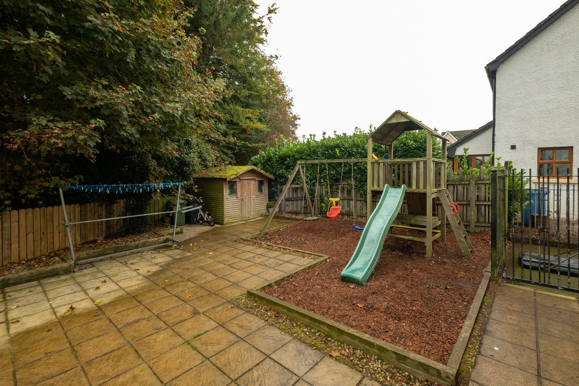 Externally, the property offers excellent outdoor space designed for both practicality and enjoyment. To the side, a tarmac driveway provides generous off-street parking, while the surrounding gardens to the side and rear create a delightful setting for family living. The spacious lawn and paved patio area offer ideal spaces for outdoor relaxation, seamlessly blending with the home’s natural surroundings. To the rear, an extensively paved area provides superb versatility, perfect as a safe play space for children or an enclosed area for small pets. All of this is beautifully framed by the tranquil backdrop of mature woodland, enhancing the sense of privacy and connection with nature.