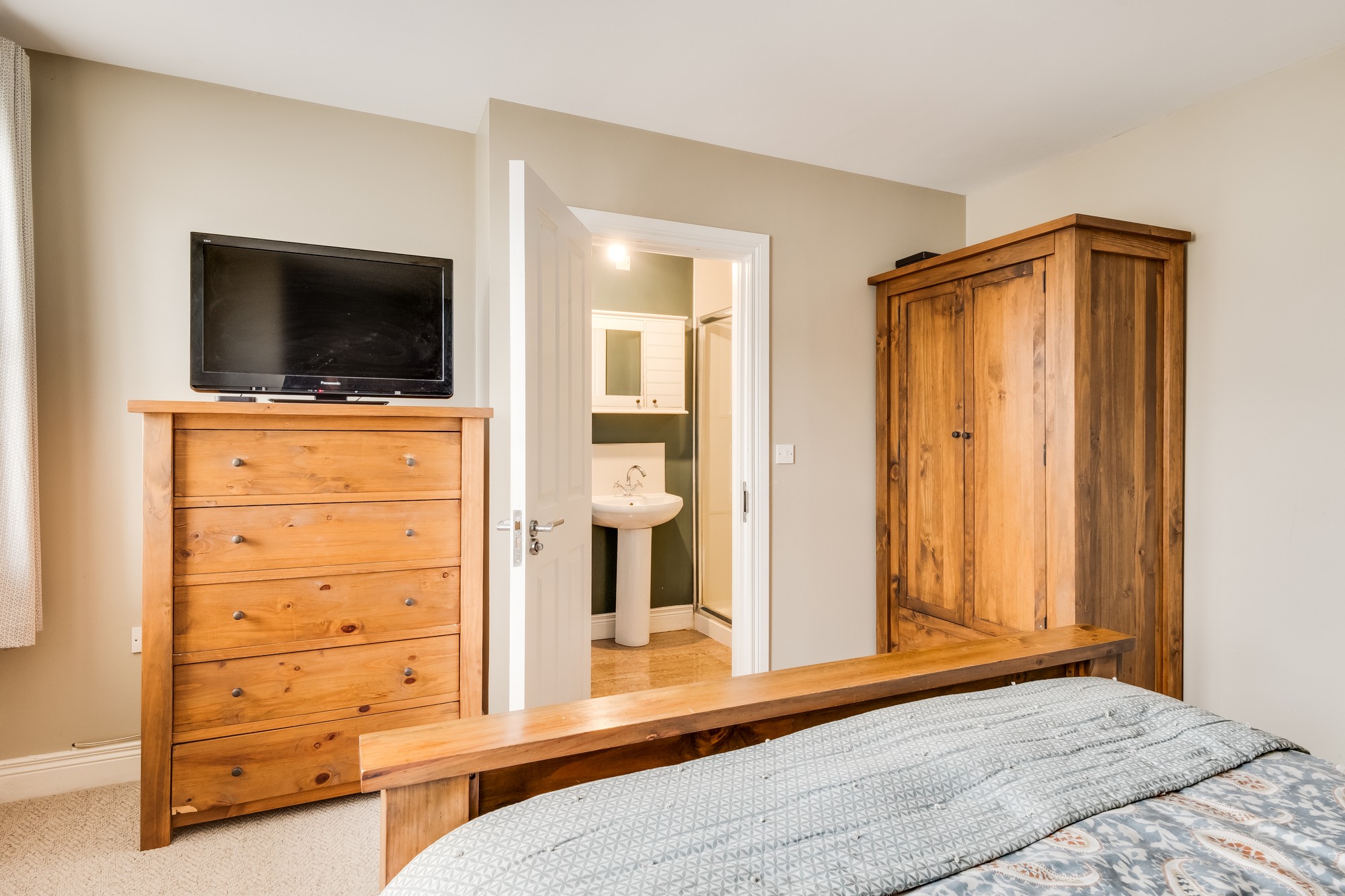 Bathroom: 11’4” x 7’3” White suite, step in shower cubicle with