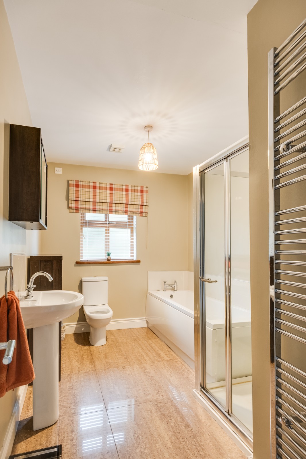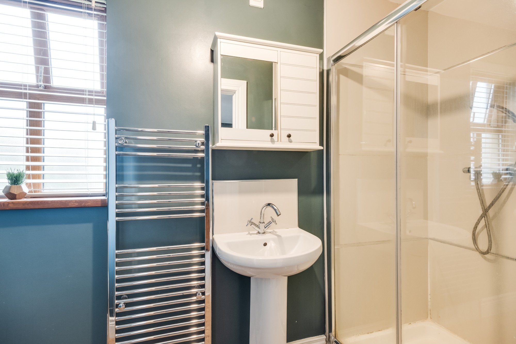 White suite, large step in shower cubicle with thermostatically controlled shower, tiled floor & splash back.