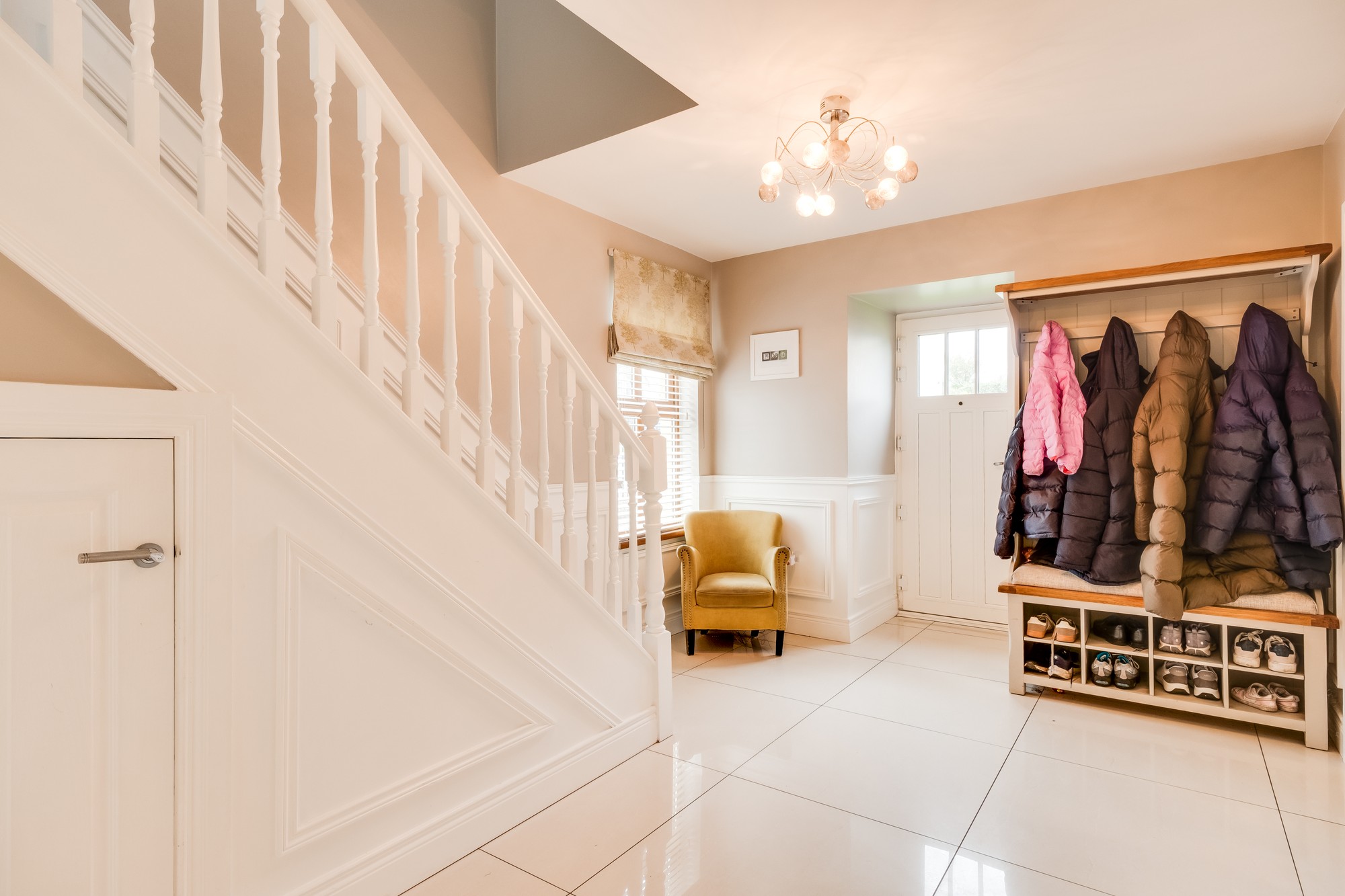 Traditional exterior door with glazed door, under stairs storage, tiled floor,moulded wall panelling.