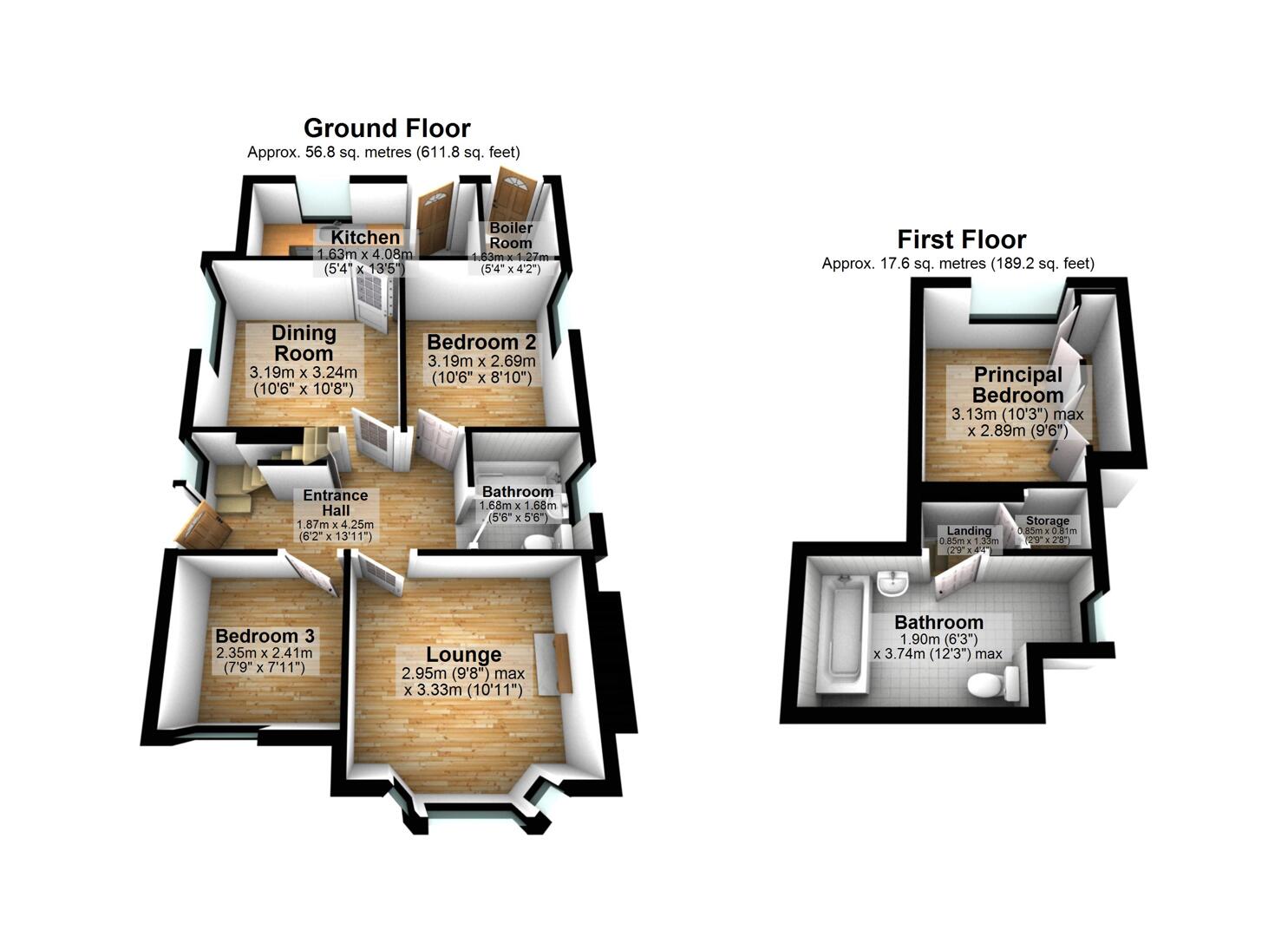 Internally the property comprises entrance hall, lounge, dining room, fitted kitchen and three bedrooms. There are bathrooms to the ground and first floor.