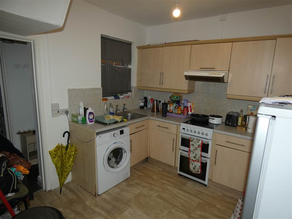 Range of high and low level units, plumbed for washing machine, single drainer stainless steel sink unit with mixer tap, storage cupboard, partially tiled walls, single panelled radiator,
