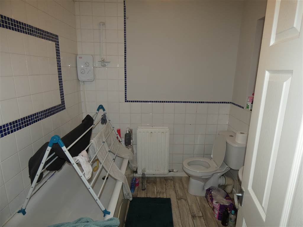 White suite comprising pedestal wash hand basin, low flush w.c., panelled bath with electric shower over, cupboard containing 'Logic' gas boiler,.partially tiled walls, double panelled radiator, extractor fan.