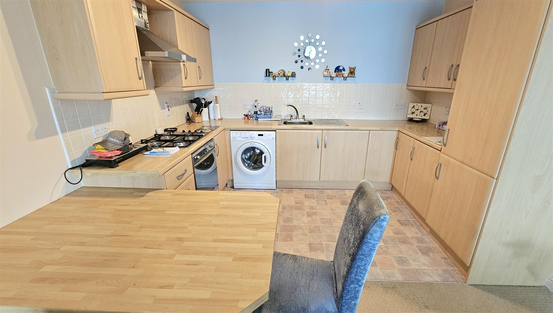 Beech style kitchen with a built in oven, hob, extractor and fridge freezer