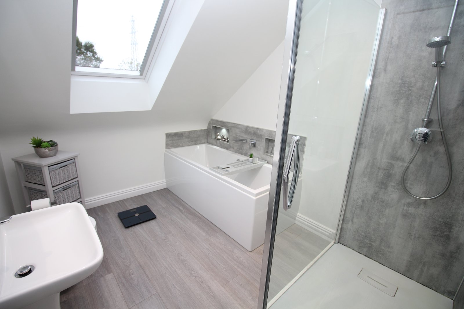 Lavish four piece white suite comprising panelled bath, separate shower cubicle with Aqualisa Quartz shower attachment, wash hand basin and wc. Heated towel rail. Touch mirror with lighting. Ultimo vinyl plank flooring