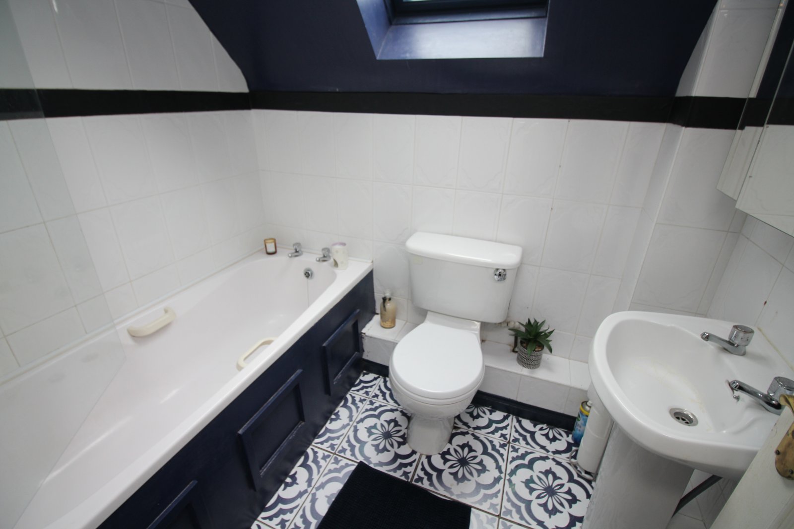 Wood panelled bath with wall mounted Mira electric shower, pedestal wash hand basin and low flush wc. Part tiled walls and tiled floor.