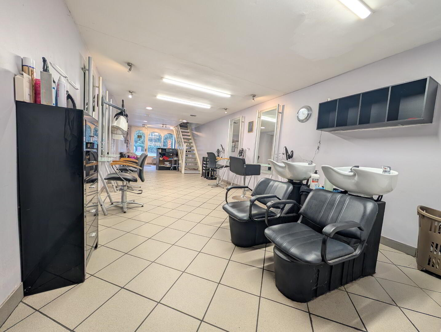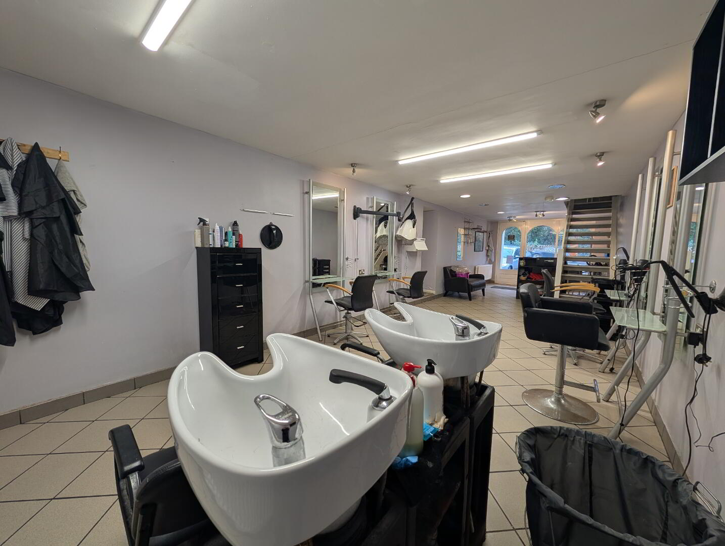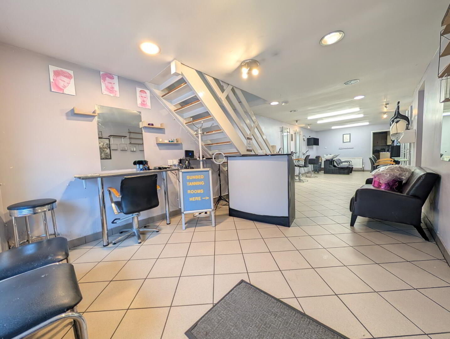 Shopfront opening into tiled shop floor, currently fitted out to a high spec as hairdressing salon with reception/seating area, 5 cutting stations and 2 wash points