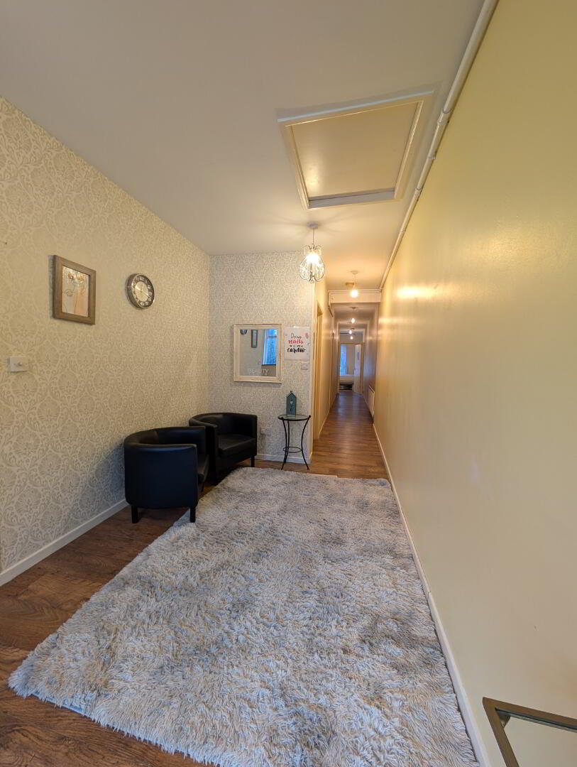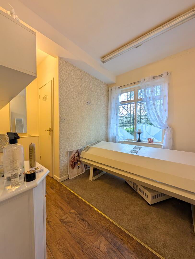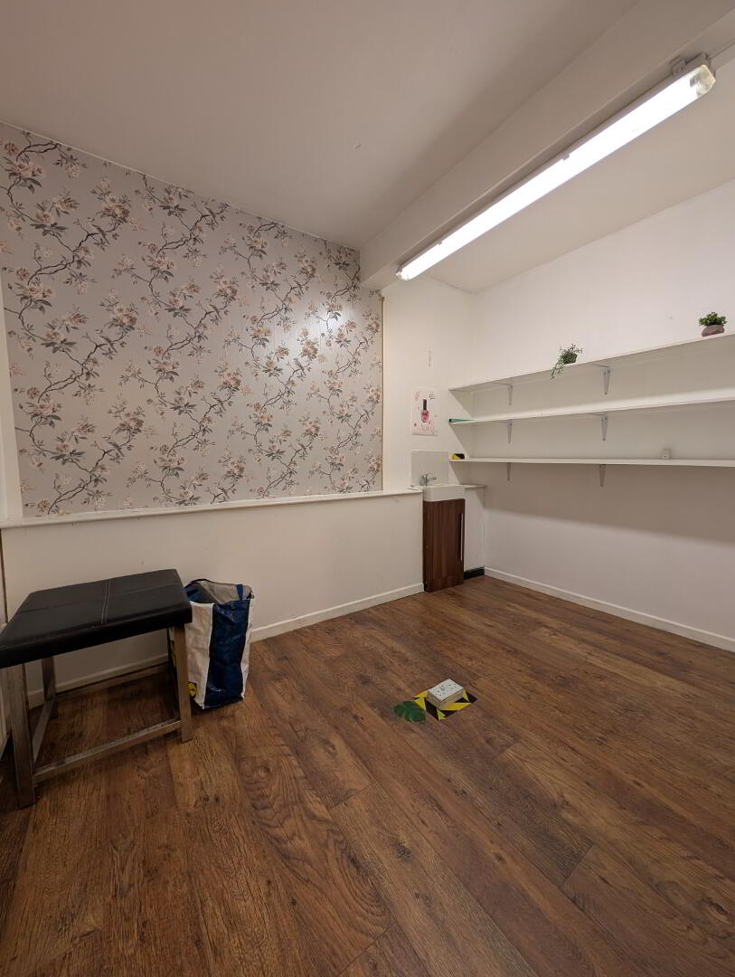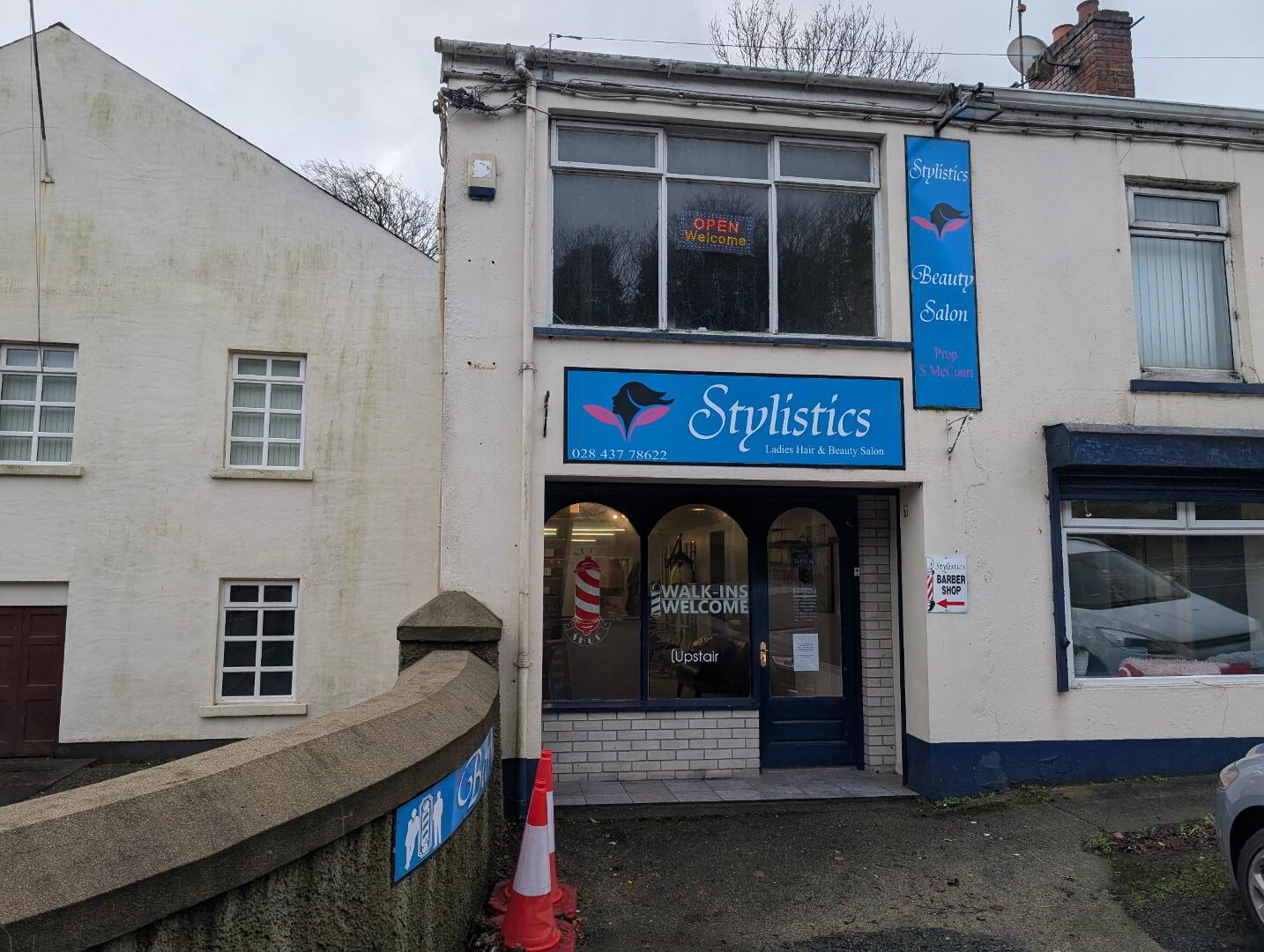 Shopfront opening into tiled shop floor, currently fitted out to a high spec as hairdressing salon with reception/seating area, 5 cutting stations and 2 wash points