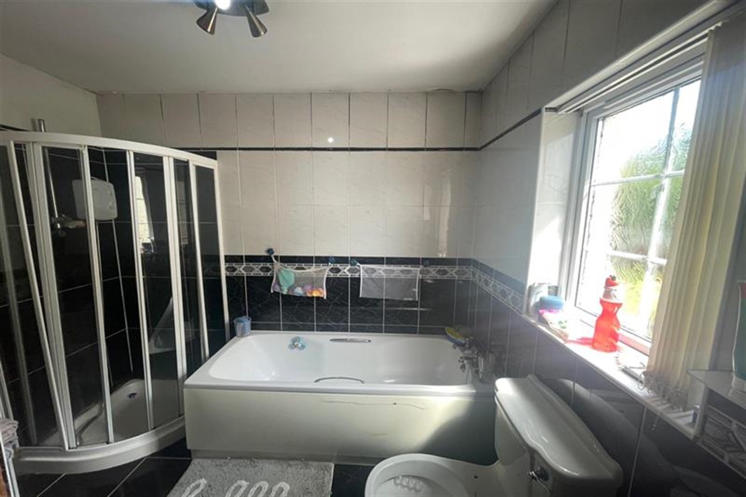 Ceramic tiled floor, tiled walls, white suit comprising, panelled bath, pedestal wash hand basin, w.c., shower cubicle with 'Triton' electric shower.