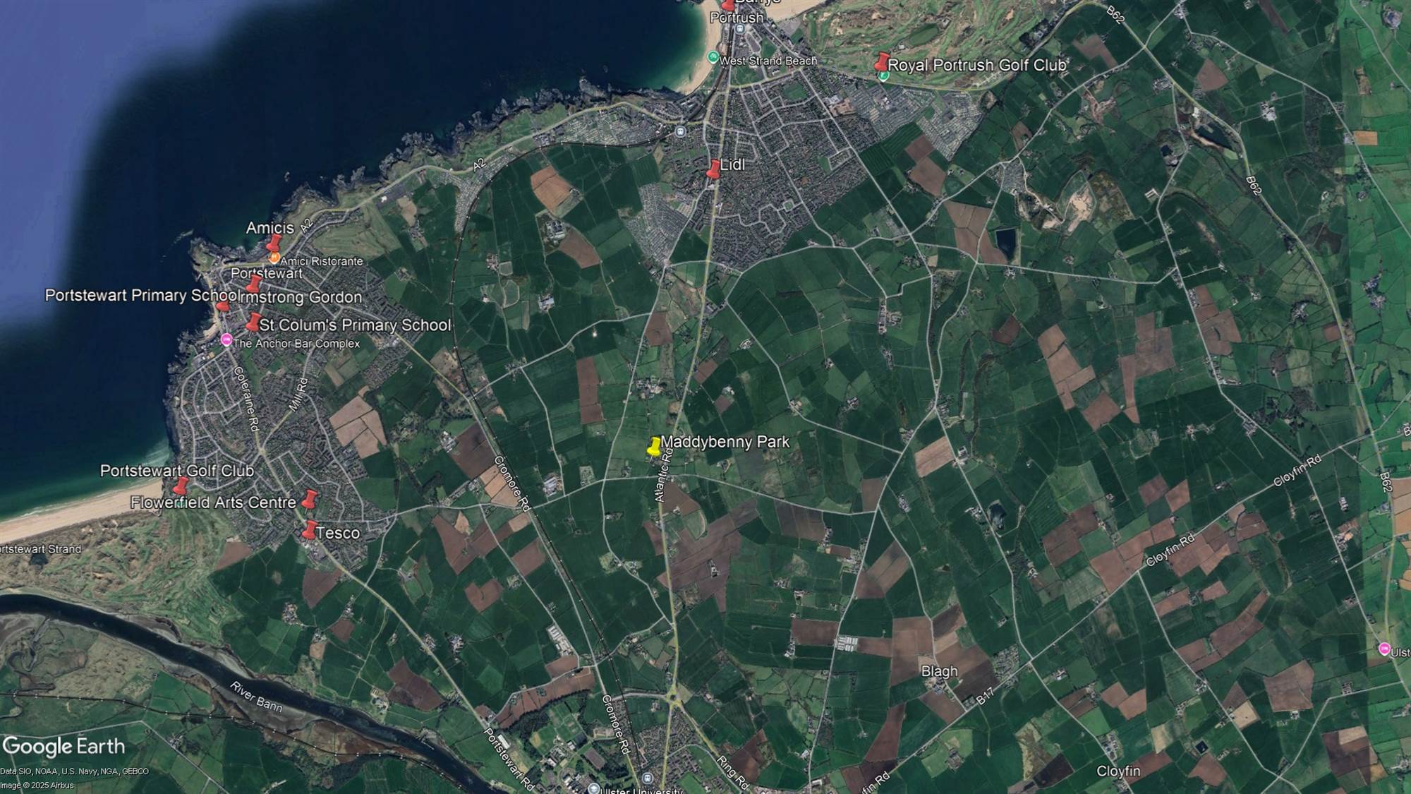 Leaving Portrush on the Atlantic Road heading towards Coleraine, Maddybenny Park will be your last right before Islandtasserty Road. Proceed up the road, turn left at the top and No 10 Will be the left hand semi detached house.