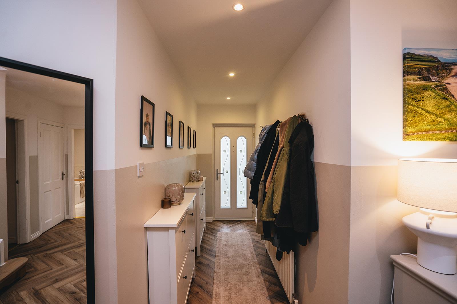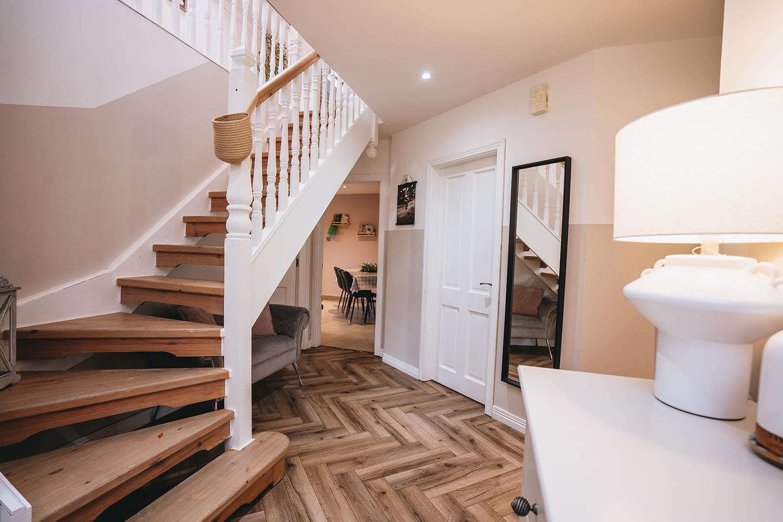 A uPVC double glazed door leads to the reception hall with LVT herringbone flooring, low voltage spotlighting and a separate shelved hotpress.