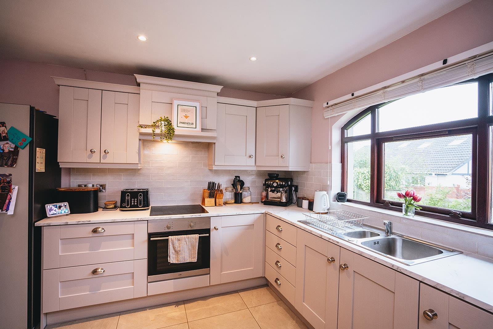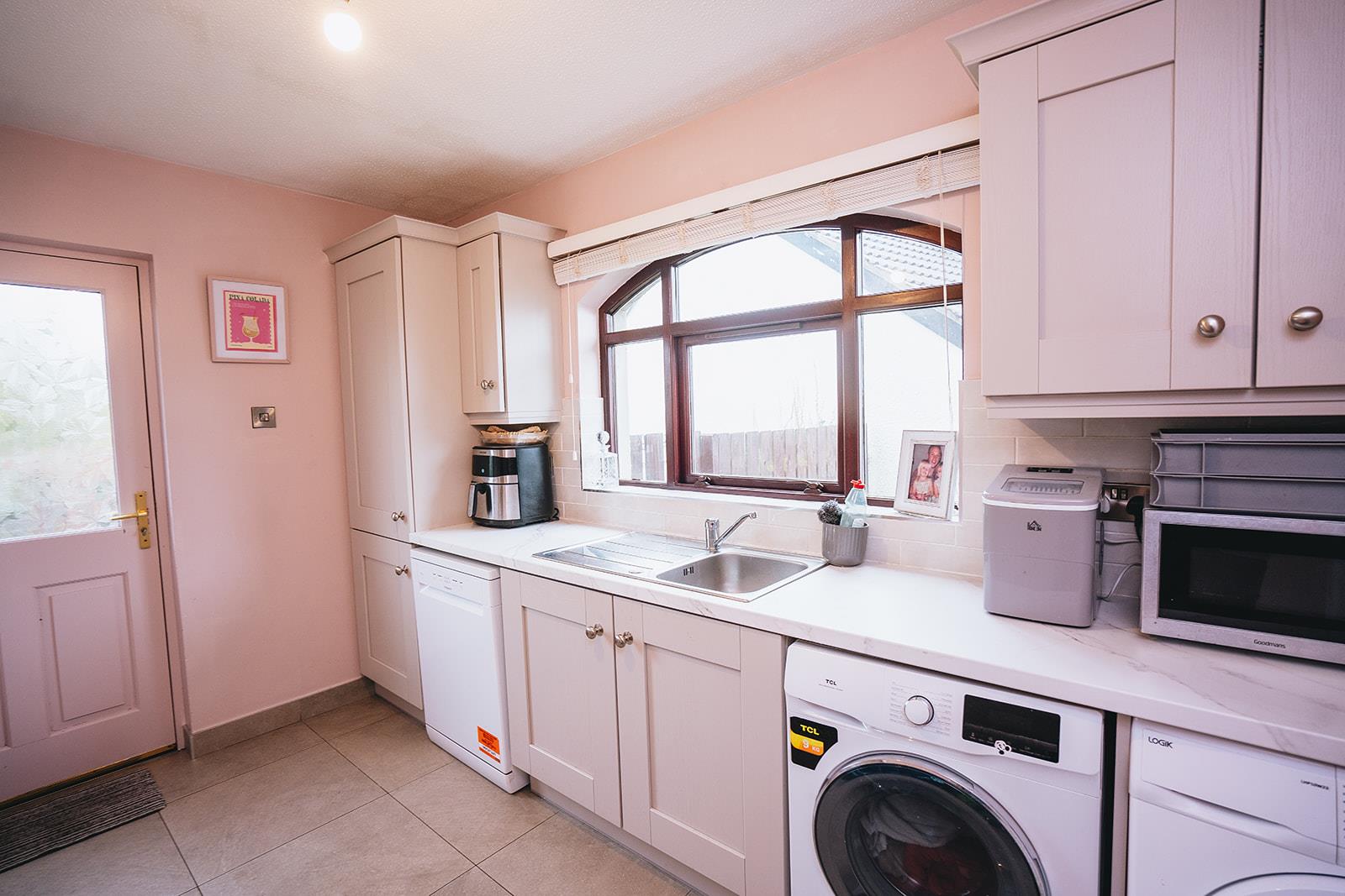 Fitted with a range of high and low level units which are tiled between, plumbed for washing machine and dishwasher, space for tumble dryer, tiled floor and door to integrated garage.