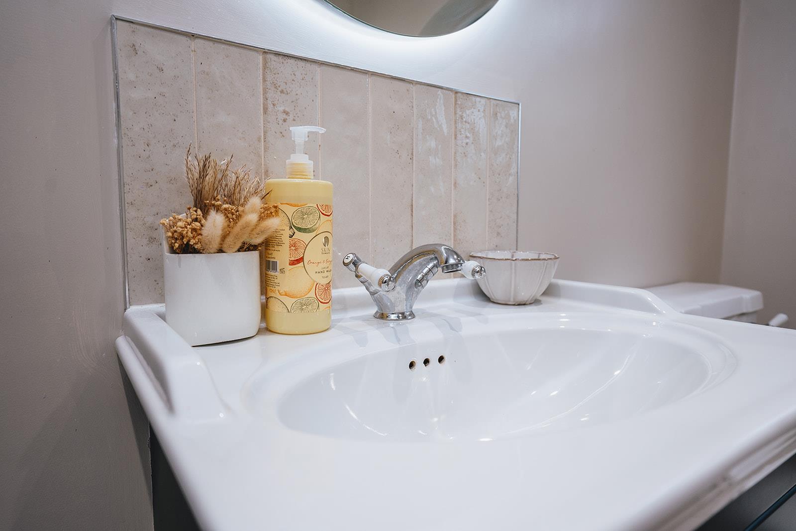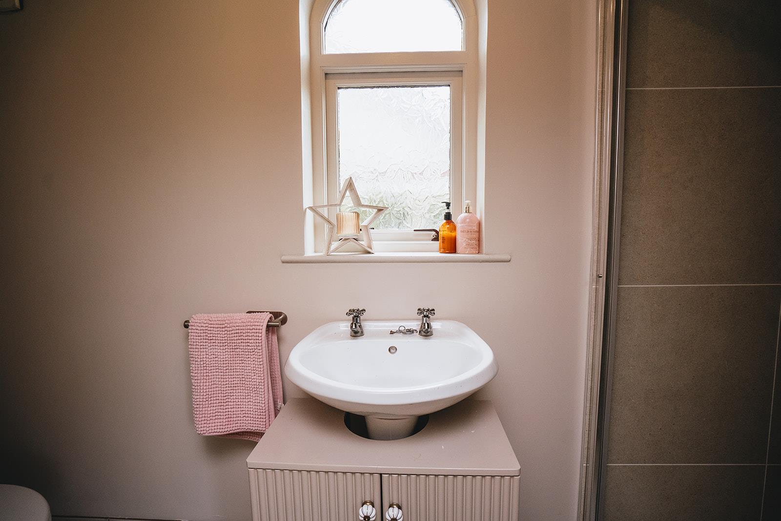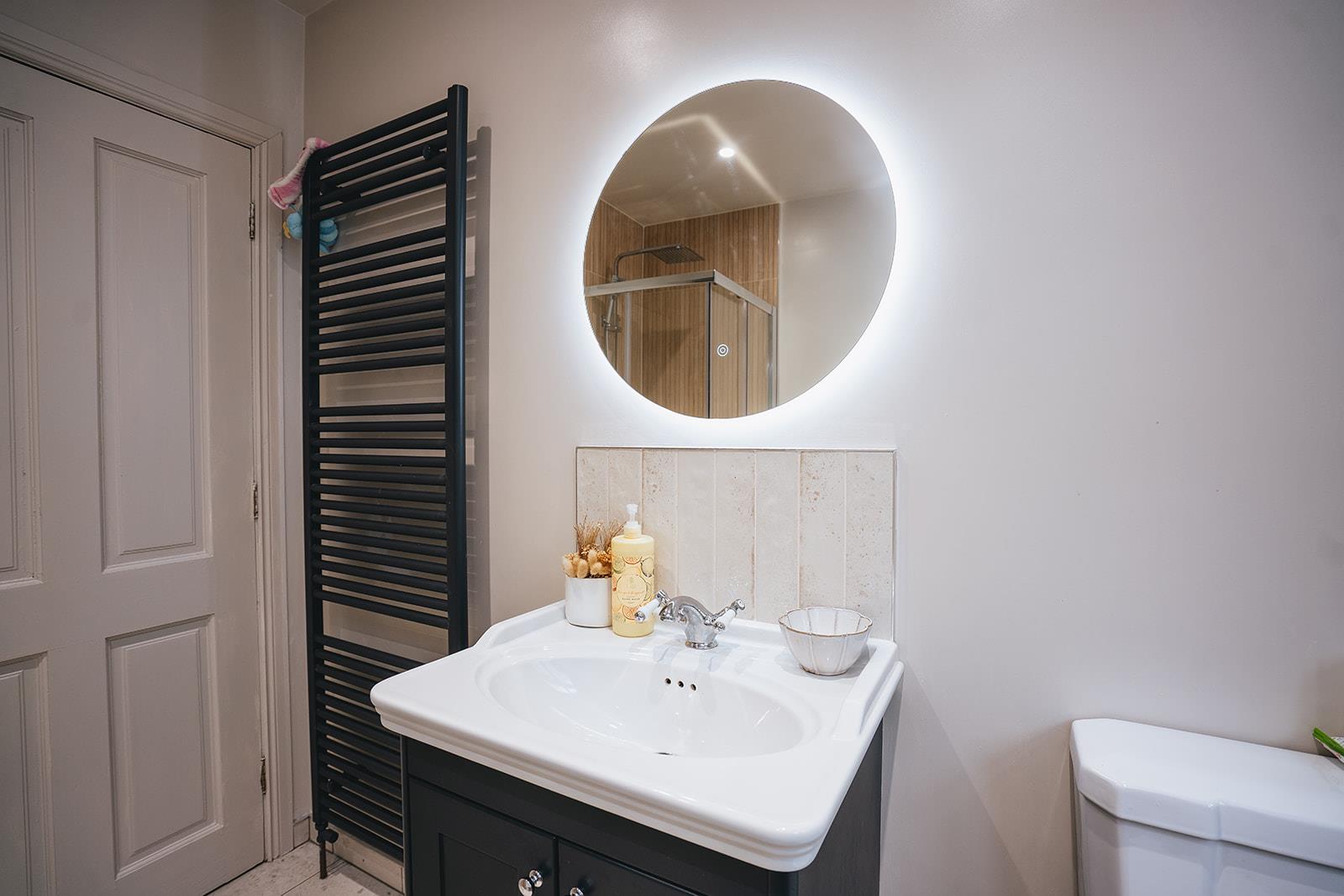 A modern family bathroom comprising panel bath with mixer tap and telephone hand shower, tiled around bath, vanity basin with mixer tap and tiled splashback, heated towel rail, tiled floor, tiled shower cubicle fitted with thermostatic shower with rainfall shower head and hand attachment.