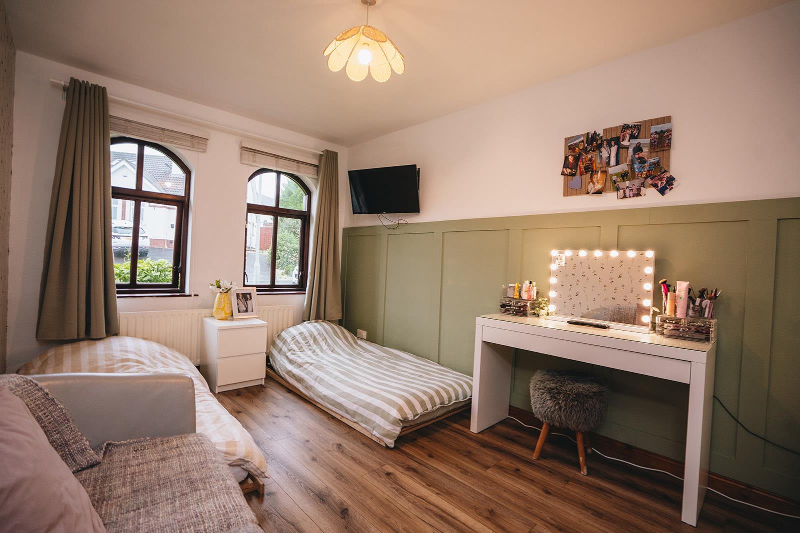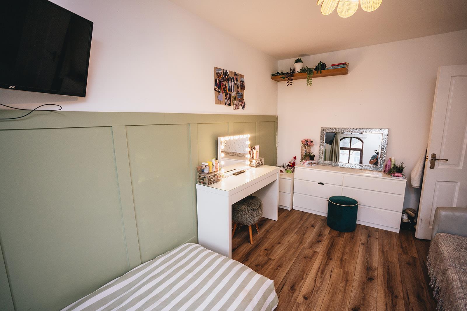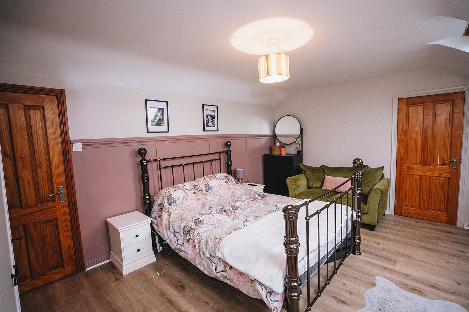 A double room with wood laminate flooring, feature wall panelling and an aspect to the rear garden. En-suite comprising low flush wc, pedestal wash hand basin, tiled floor and tiled shower cubicle with Redring Bright electric shower.