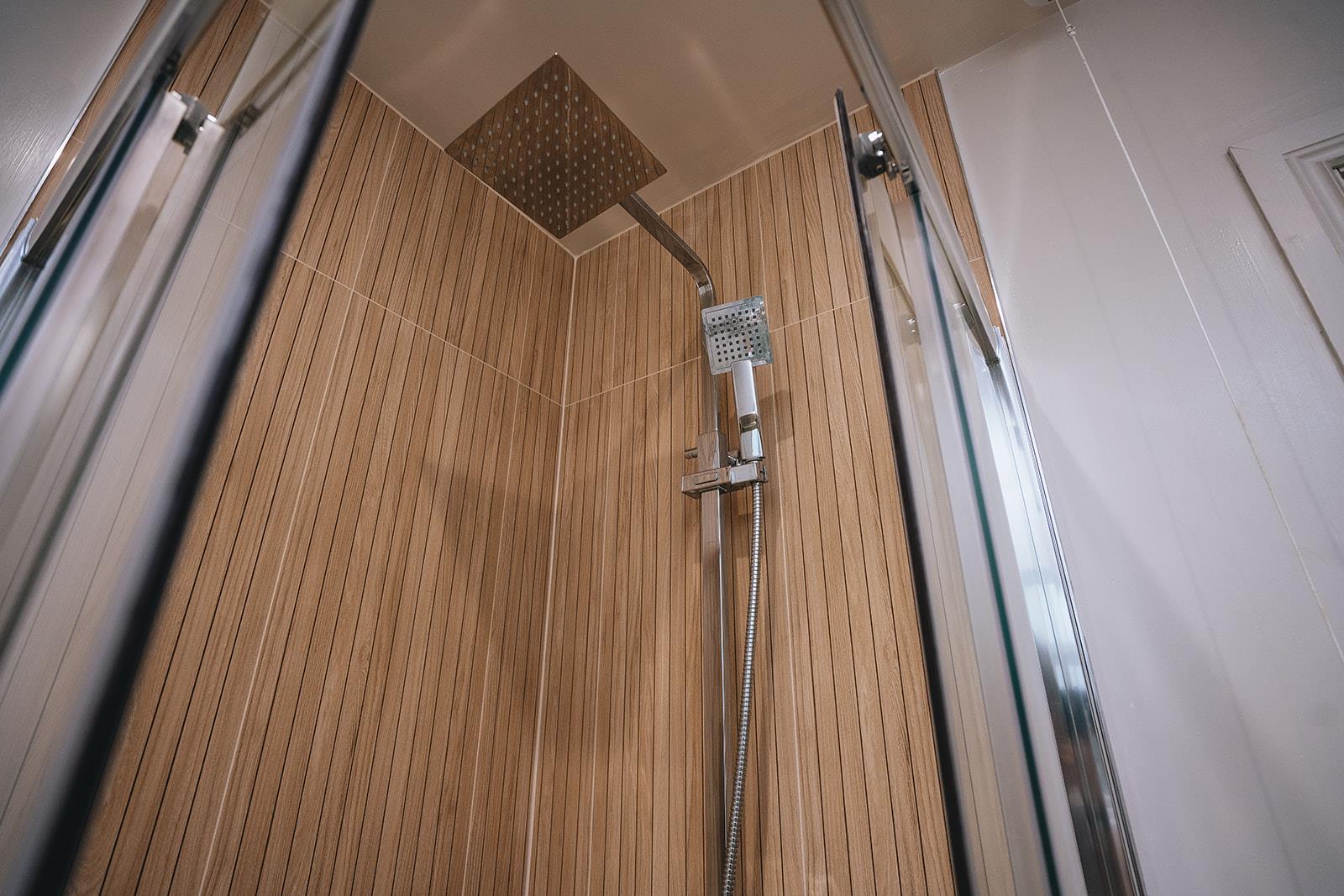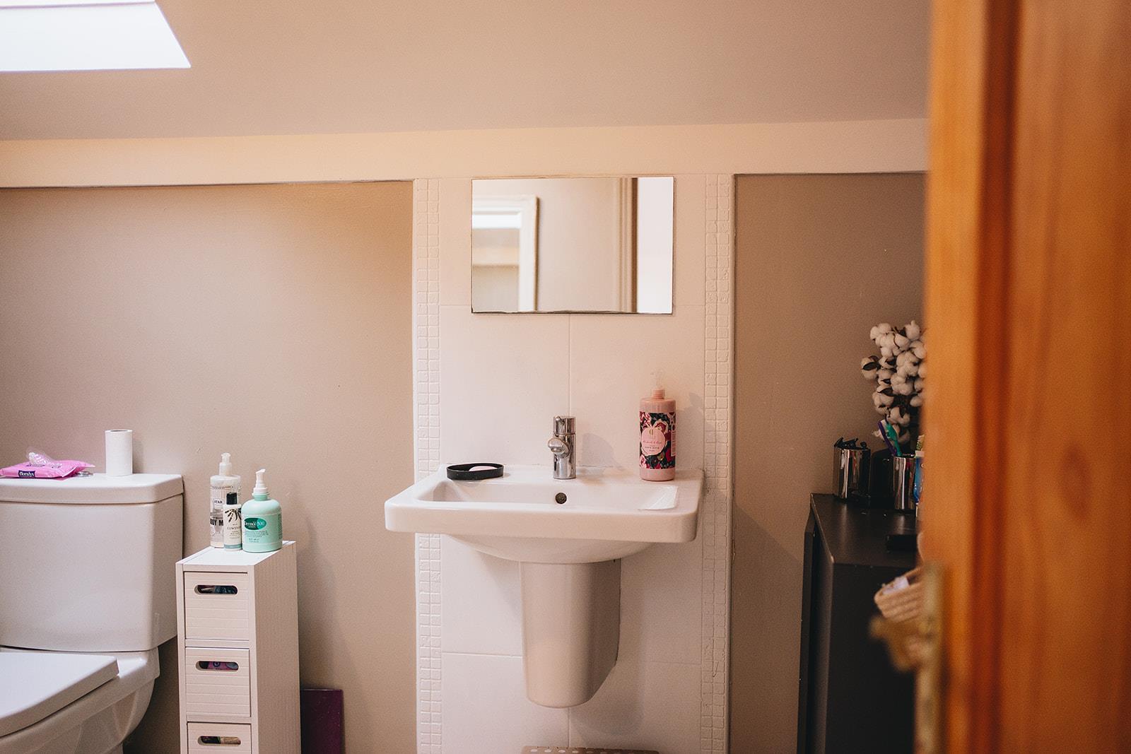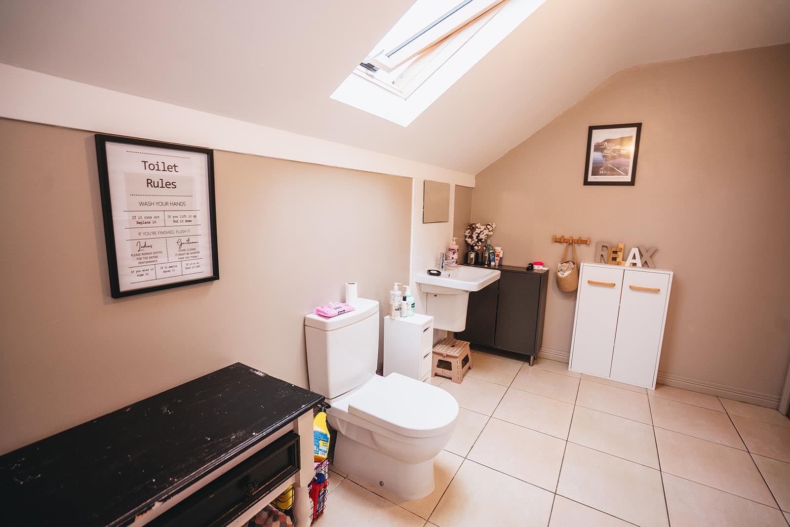 A Jack and Jill shower room comprising low flush wc, wall hung wash hand basin with mixer tap, tiled shower cubicle with Mira Vigour electric shower, tiled floor and Velux window.