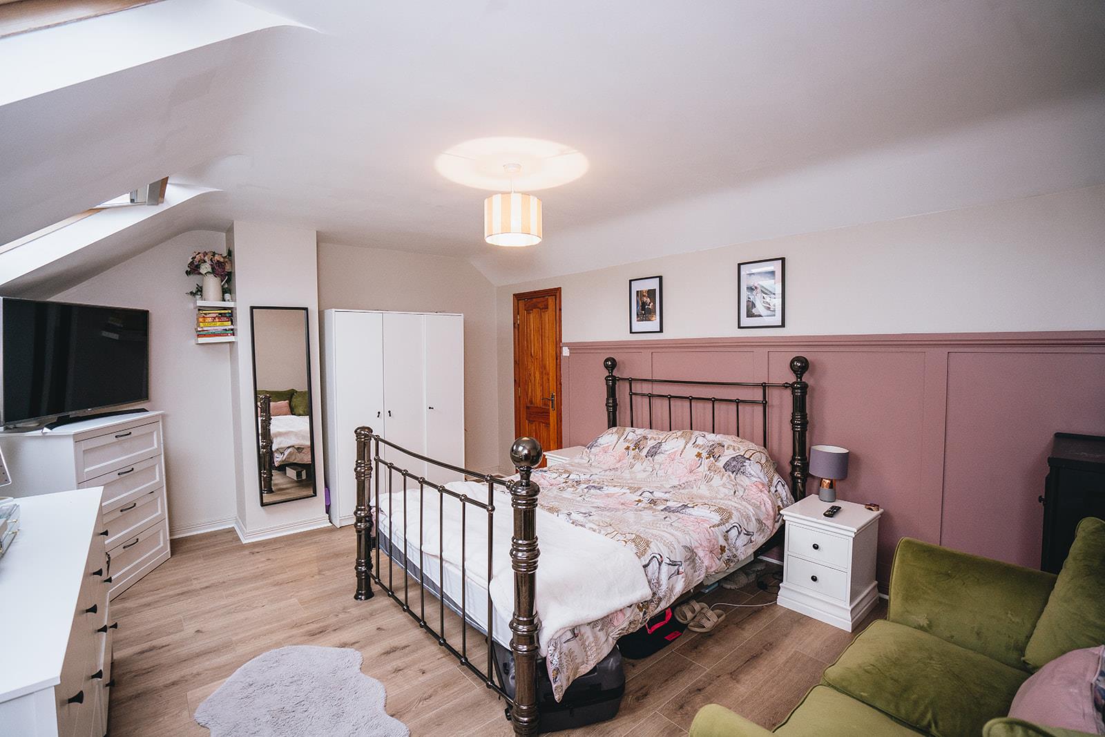 A double room with wood laminate flooring, feature wall panelling, Velux window and walk-in storage cupboard.