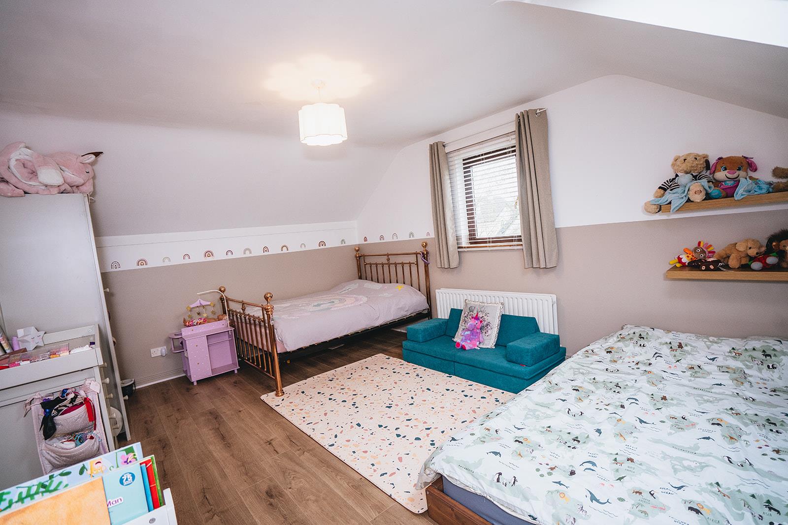 A wraparound landing with storage in the eaves, Velux windows and access to roof space storage.