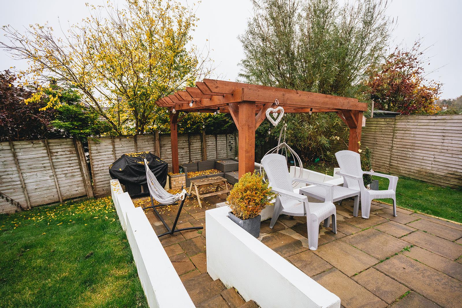 A colourstone driveway with parking leads to the front garden which is mainly laid in lawn with curved flower beds. The rear garden is also mainly laid in lawn with a range of specimen trees and shrubs, there is a paved patio area with steps down to an additional paved patio area which is covered by a pergola. The garden is fence enclosed with a pedestrian path around the property.