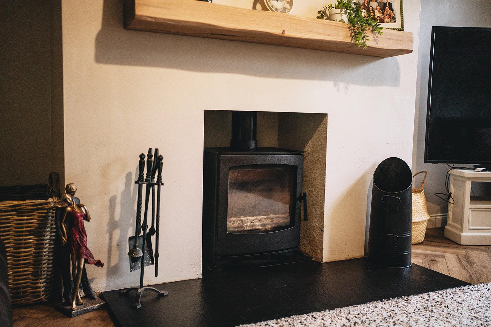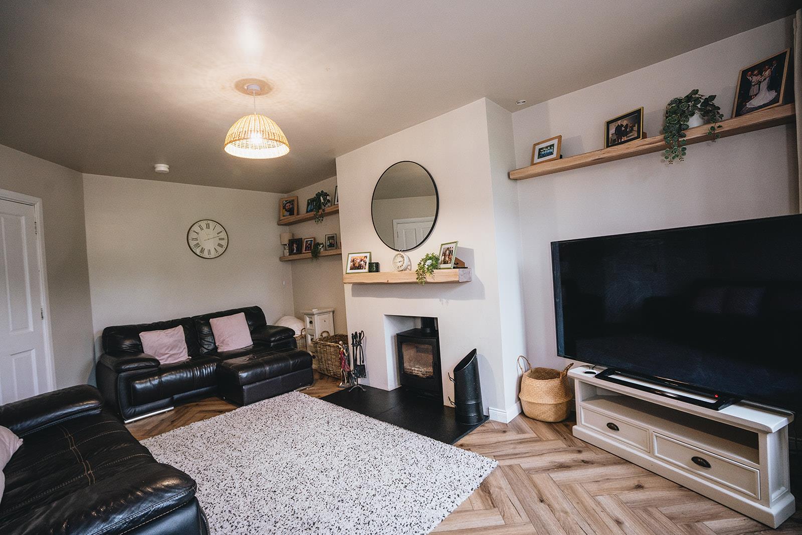 A spacious living space with wood burning stove on a slate hearth with wooden beam overmantel and LVT herringbone flooring.