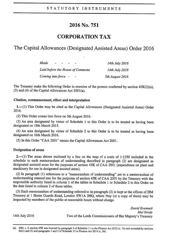 The lands being marketed represent a further area of the designated Enterprise Zone. They are clearly demarked in Capital Allowances (Designated Assisted Areas) Order 2016 as being designated assisted areas for the purposes of section 45K of the Capital Allowances Act 2001. This order provides for 100% first year capital allowances (FYA's) for companies investing in plant or machinery for use primarily in designated areas within Enterprise Zones (subject to conditions being met).
