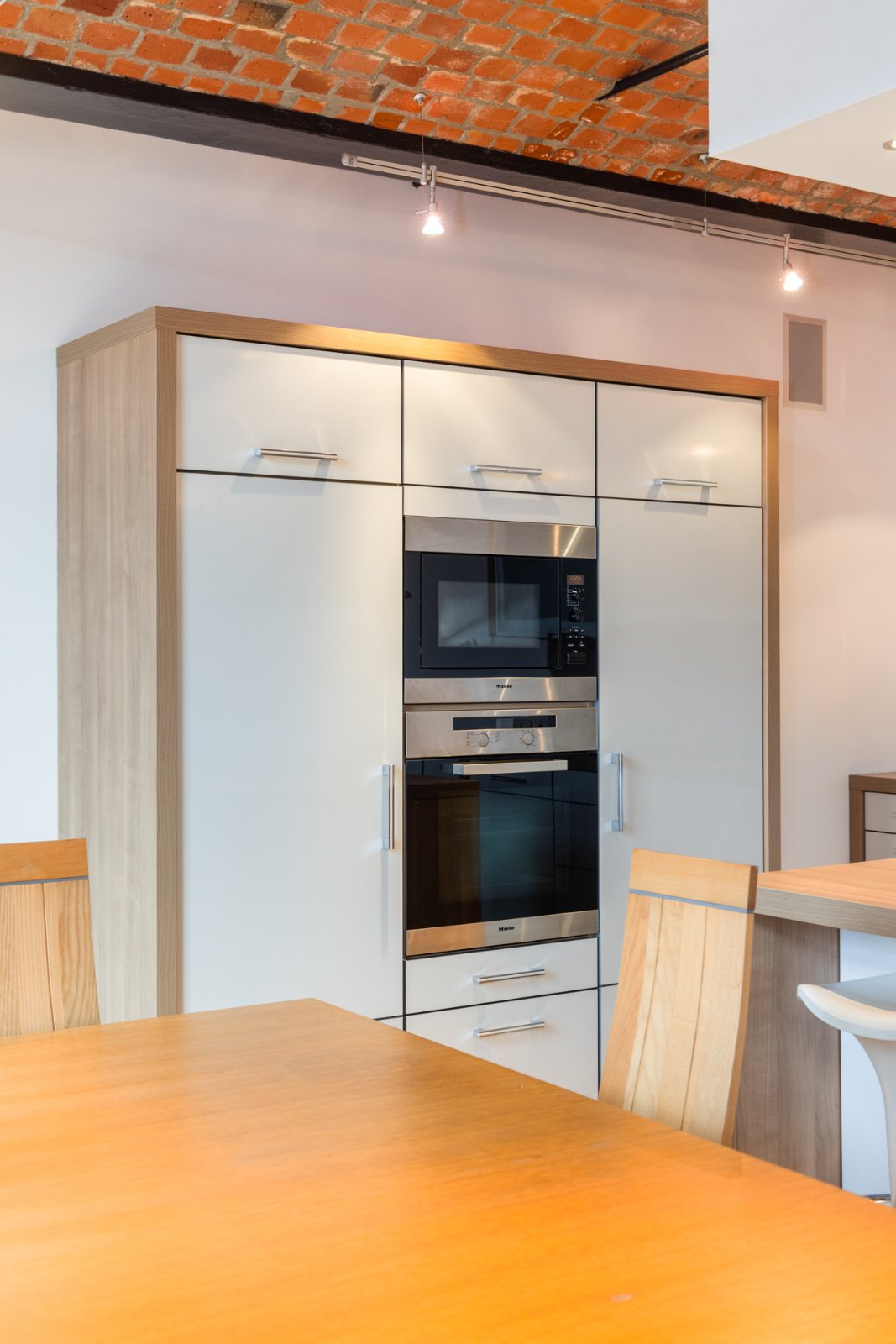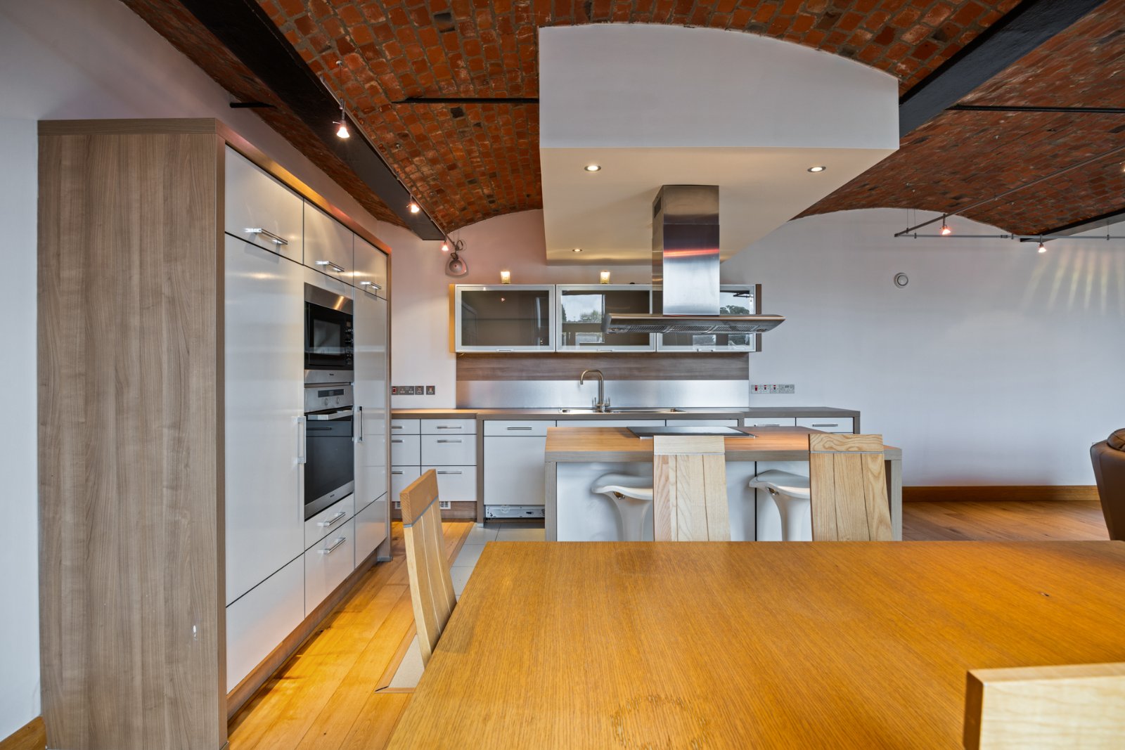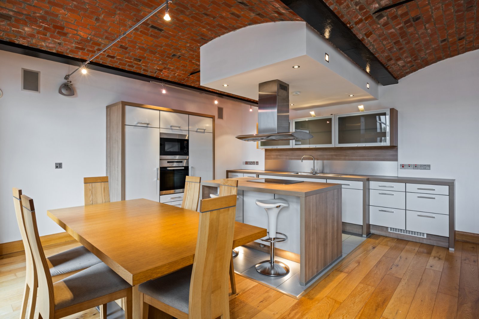 Franke 1.5 tub single drainer stainless steel sink unit with mixer taps, excellent range of high and low level modern units with oak effect Formica roll edge work surfaces, integrated fridge and freezer, oven and dishwasher, microwave (all Miele), integrated washing machine, island with matching units and worktops, glazed pot drawers, Miele induction hob, Neff stainless steel extractor hood, 2 pull out larder drawers and breakfast bar, ceramic tiled floor, polished oak floor, modern lighting scheme, feature wall mounted inset electric fire, recess for wall mounted TV, surround sound system with Panasonic amp, Jamo subwoofer and integral surround sound wall speakers, feature Belfast Brick barrel ceiling, 3 full height Westerly facing windows, French doors to Balcony.