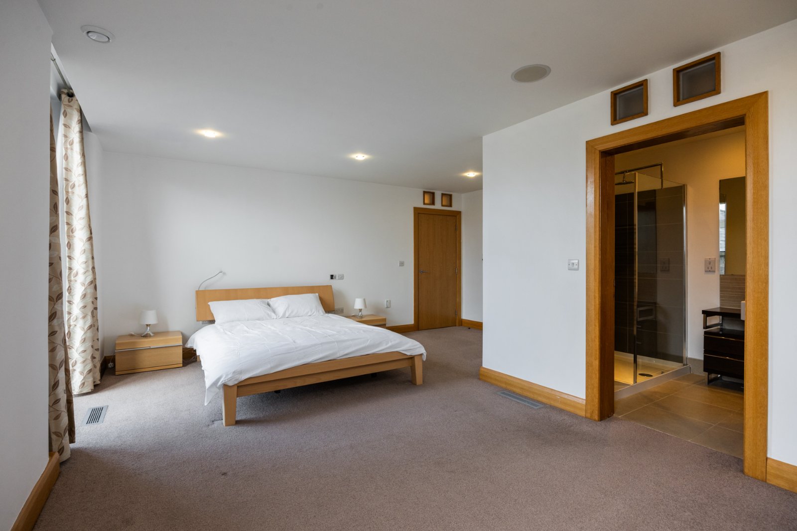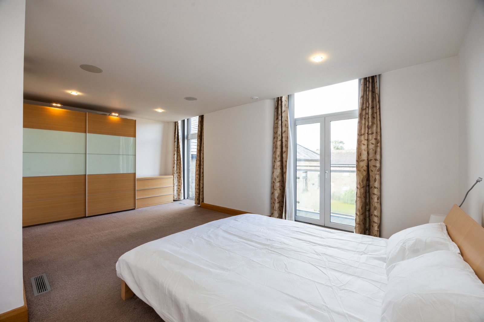 Range of modern Sliderobes, recessed spotlighting, ceiling speakers, 2 full height Westerly facing windows, French doors to Balcony.