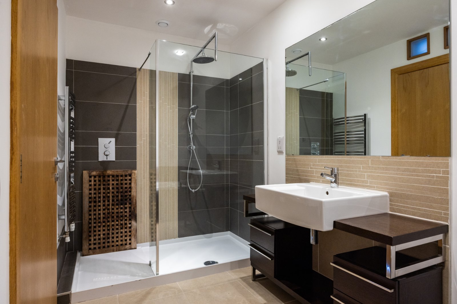 Modern white Villeroy and Boch suite comprising: Panelled bath with mixer taps, large walk in separate shower cubicle with thermostatically controlled shower, rain head and telephone hand shower, Walnut floor stand vanity, white enamel wash hand basin with mixer taps, push button WC (concealed cistern), feature wall and floor tiling, chrome towel radiator, recessed spotlighting, ceiling speaker, shaver point.
