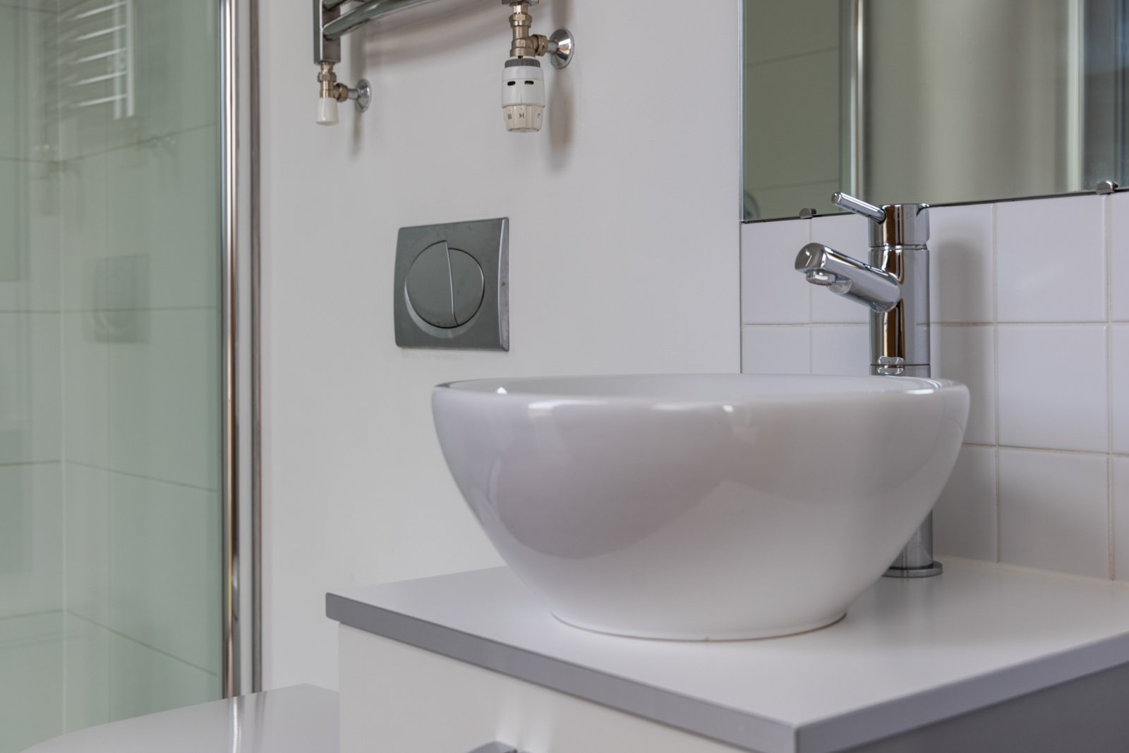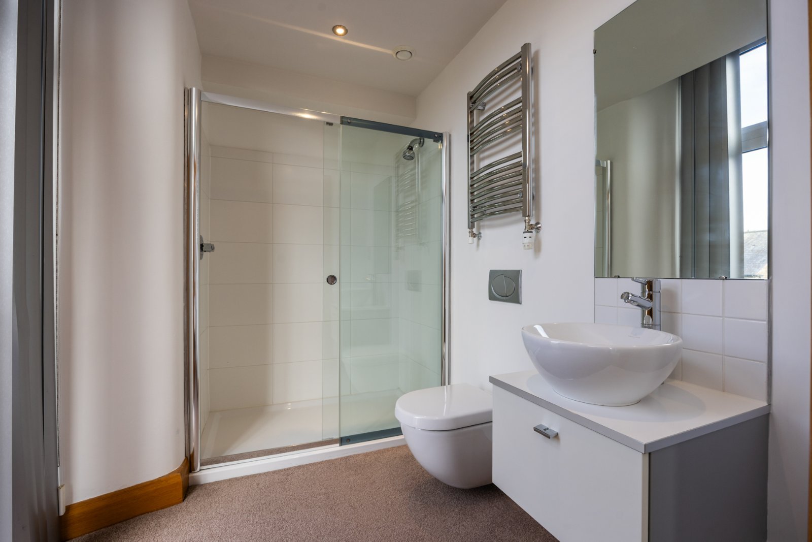 Modern white Villeroy and Boch suite comprising: Large separate fully tiled shower cubicle with thermostatically controlled shower, floating vanity unit with white wash hand basin with mixer taps, push button WC (concealed cistern), chrome towel radiator, recessed spotlighting, full height Westerly facing window, shaver point.