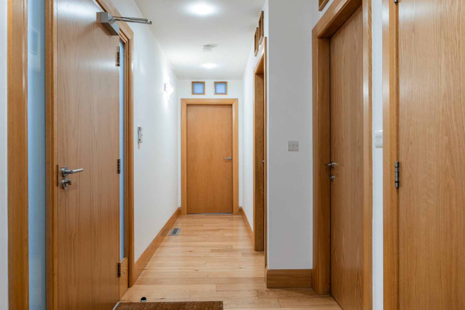 Ceramic tiled floor, recessed spotlighting on sensors leading to solid oak front door with frosted glass sidelights to Apartment 8.
