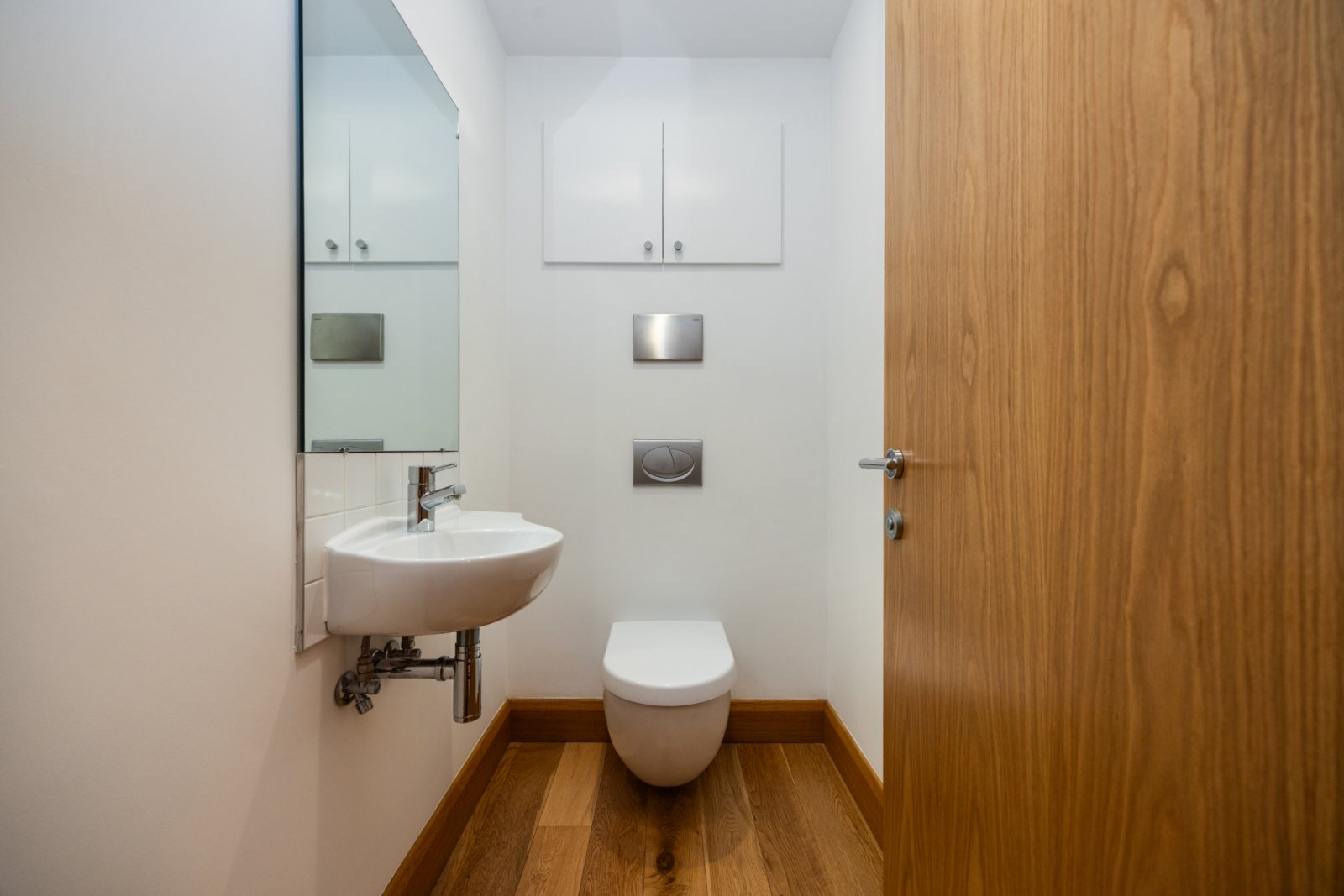 Modern white Villeroy and Boch suite comprising: wall mounted wash hand basin with mixer taps, push button WC (concealed cistern), polished oak floor, recessed spotlighting.