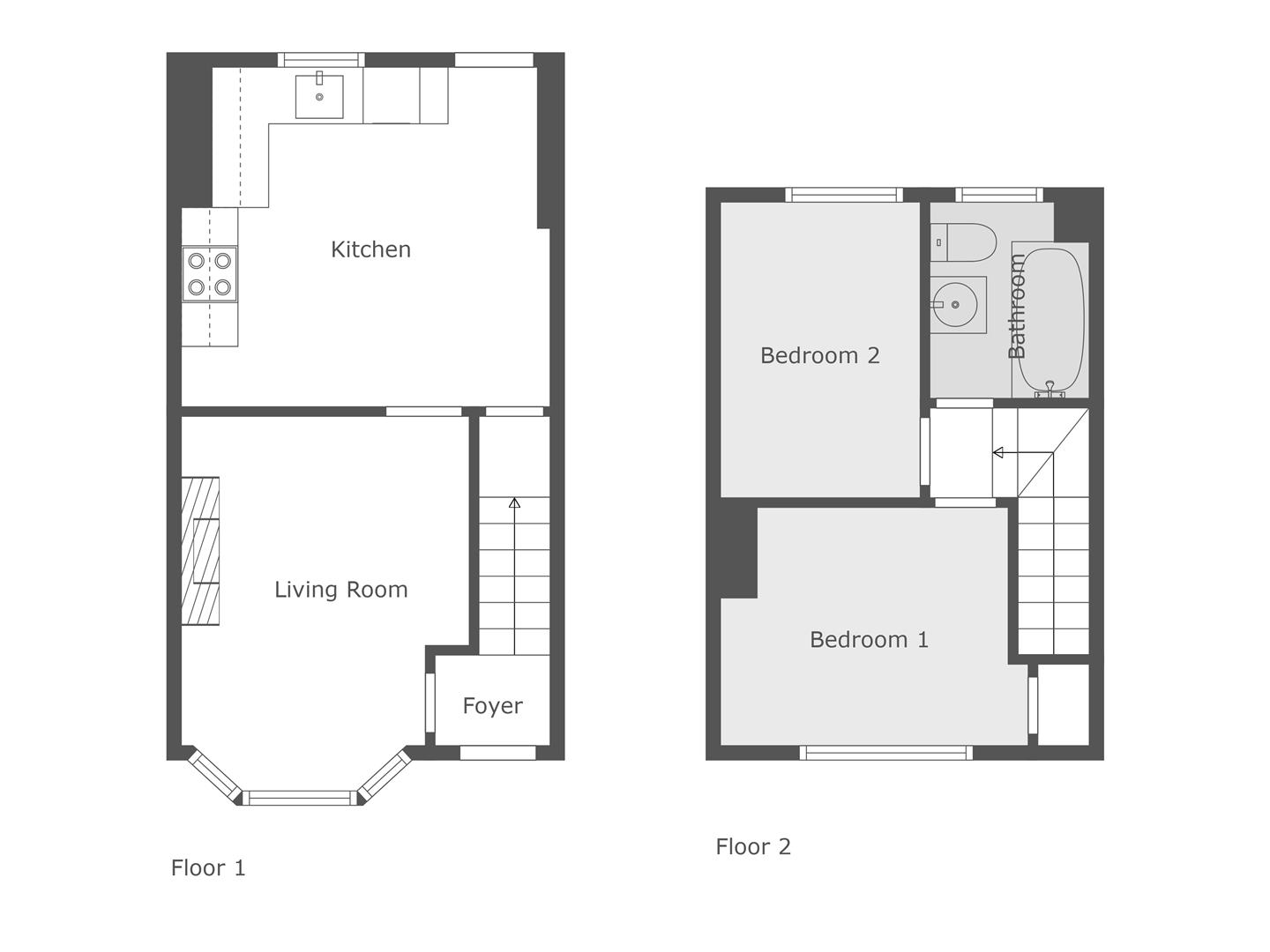 The ground floor features a bright lounge with bay window and a separate kitchen/dining area. Upstairs, there are two well-proportioned bedrooms and a bathroom.