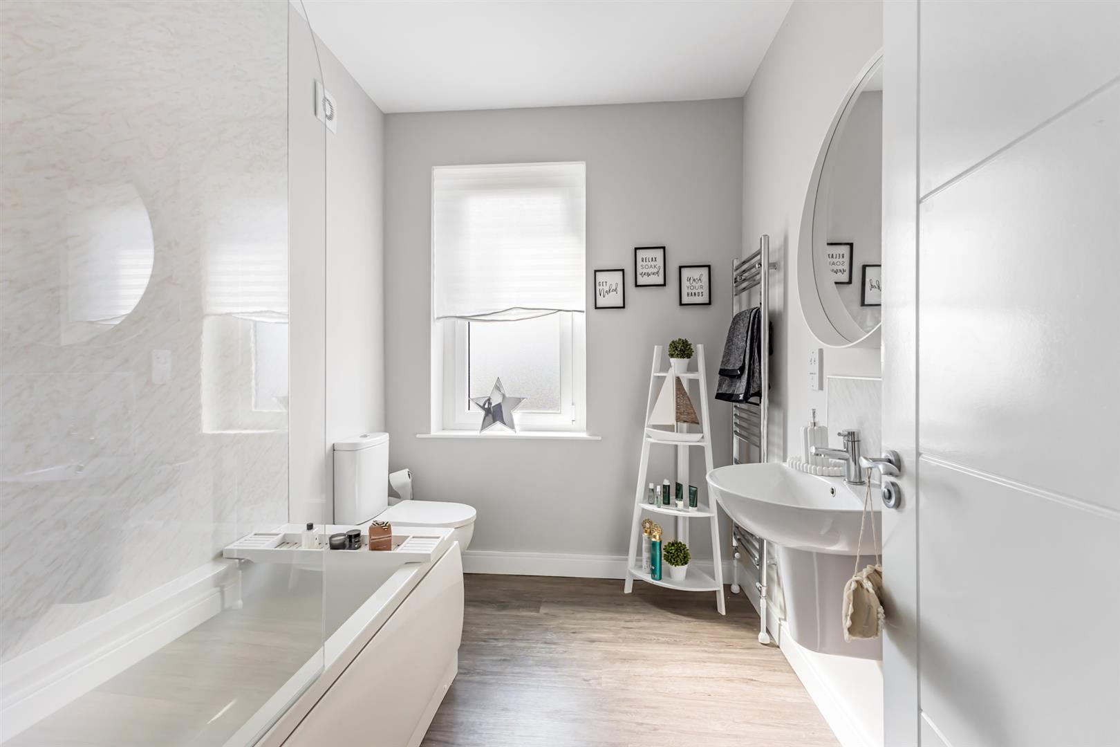 White suite comprising panel bath with thermostatically controlled shower unit and telephone shower attachment; glass shower screen; close coupled wc; semi pedestal wash basin with mono mixer tap; chrome wall mounted towel radiator; Karndean luxury flooring; extractor fan; Pvc cladding behind bath; shaver point.